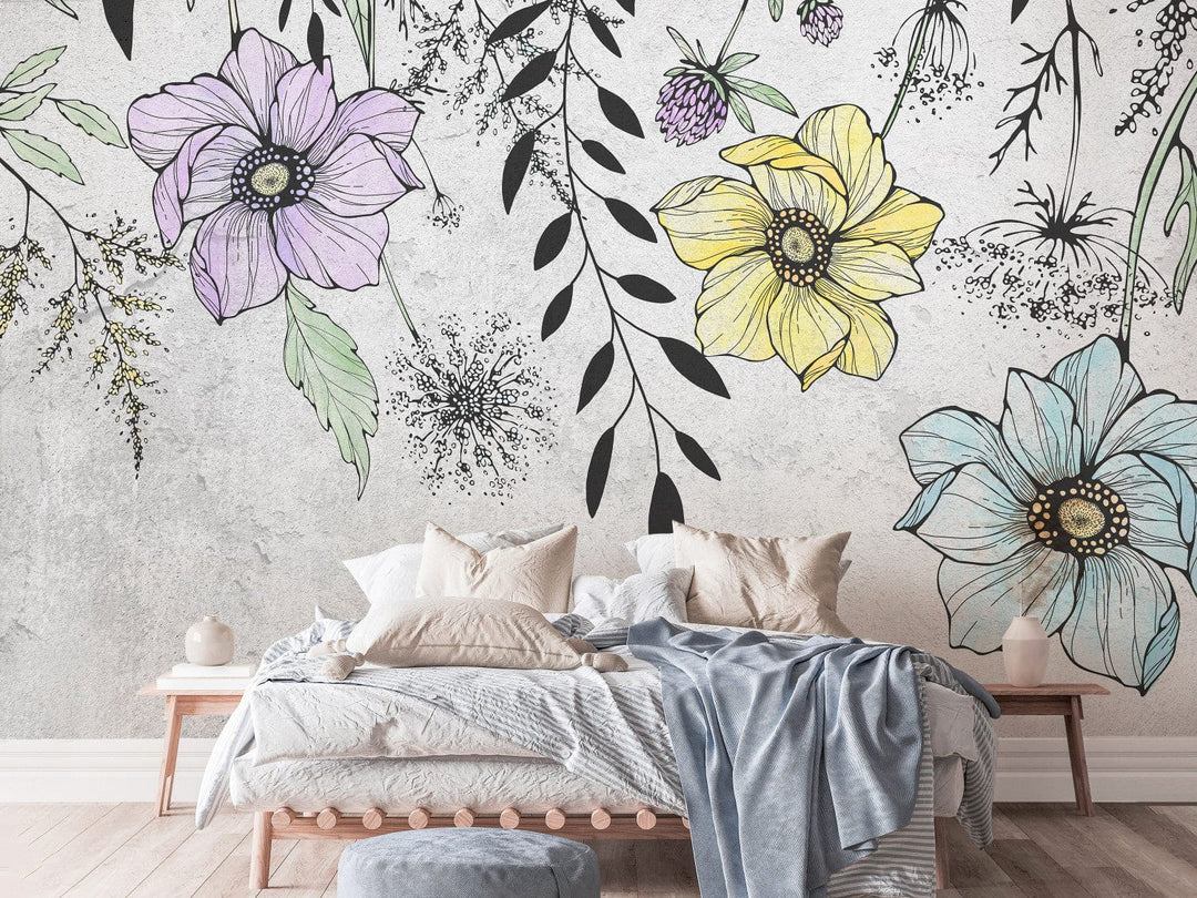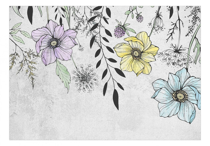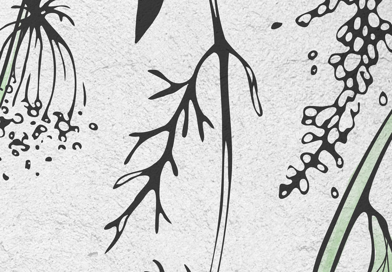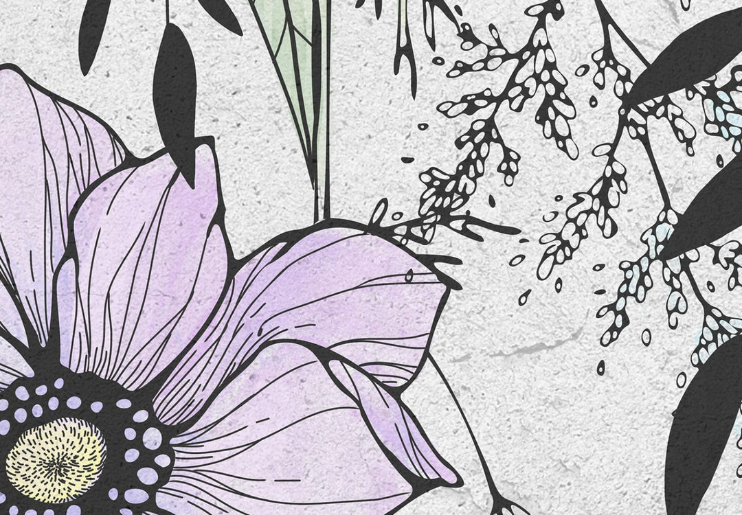 Fototapetes - Grafiskā pļava – ziedu motīvs lineart stilā uz pelēka fona - 143080