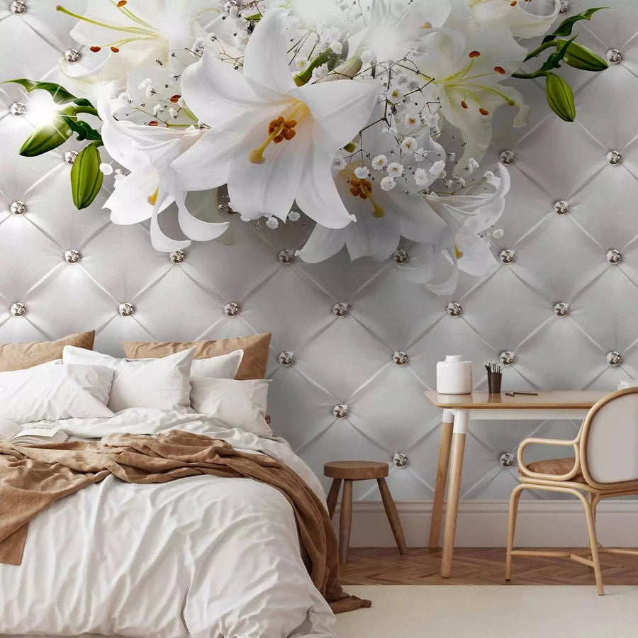Fototapetes - Baltas dārza lilijas uz pelēka fona guļamistabai G-ART