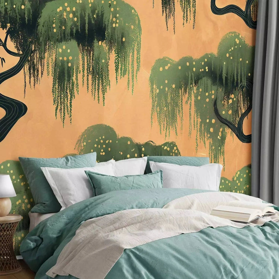 Fototapetes - Maģiskie koki - zari ar lapām uz zelta fona japāņu stilā G-ART