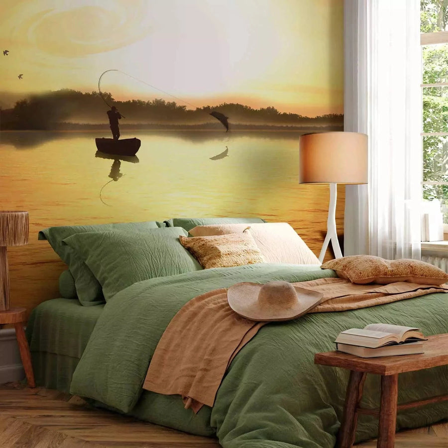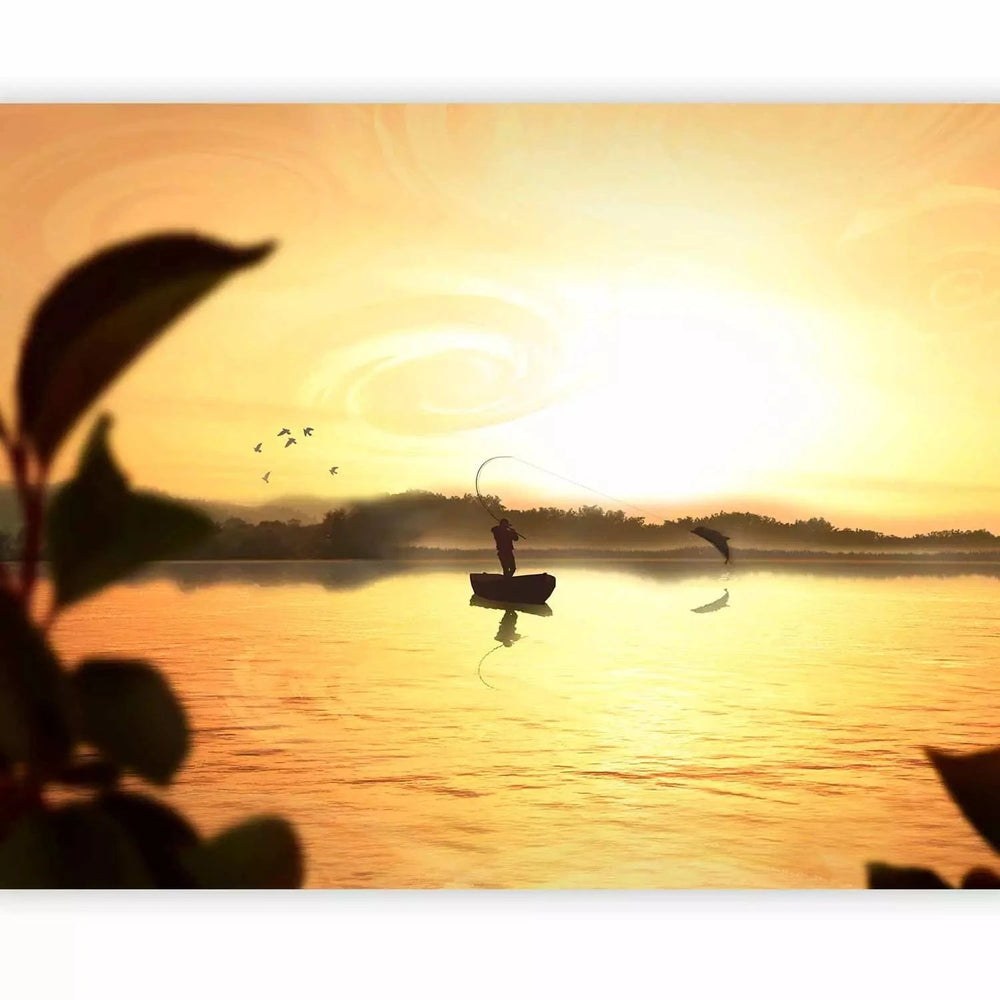 Fototapetes ar saulrietu - Saulriets un zvejnieku laiva, dzeltenā G-ART