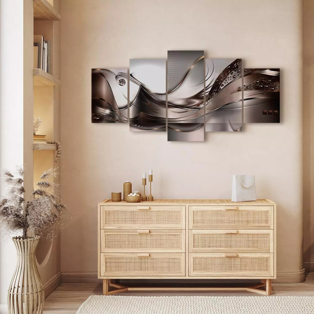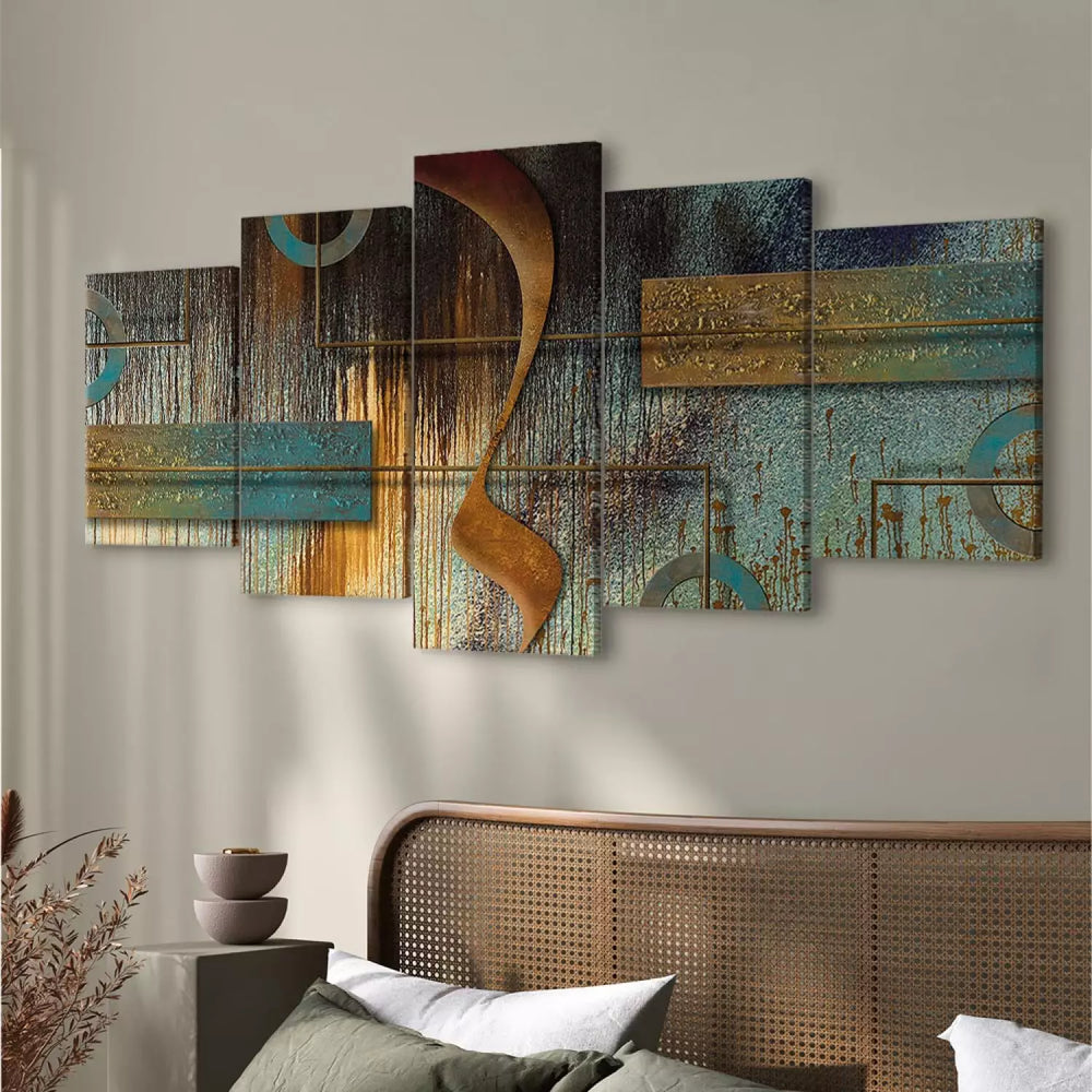 Daudzveidīgs stils: Mūsu kolekcija piedāvā plašu abstraktu dizainu klāstu – no gaisīgiem un smalkiem akcentiem ar zelta elementiem līdz dinamiskām ainavām ar košiem zelta atspulgiem.