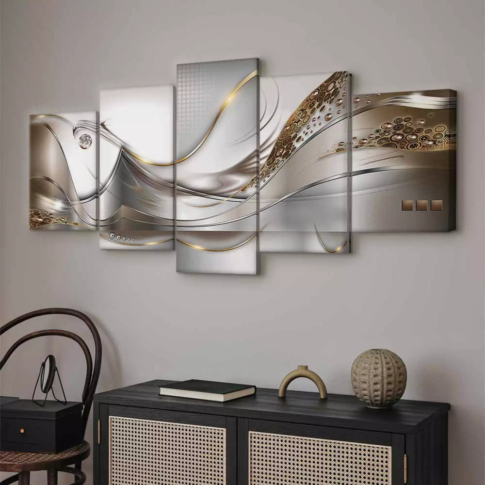 Daudzveidīgs stils: Mūsu kolekcija piedāvā plašu abstraktu dizainu klāstu – no gaisīgiem un smalkiem akcentiem ar zelta elementiem līdz dinamiskām ainavām ar košiem zelta atspulgiem.