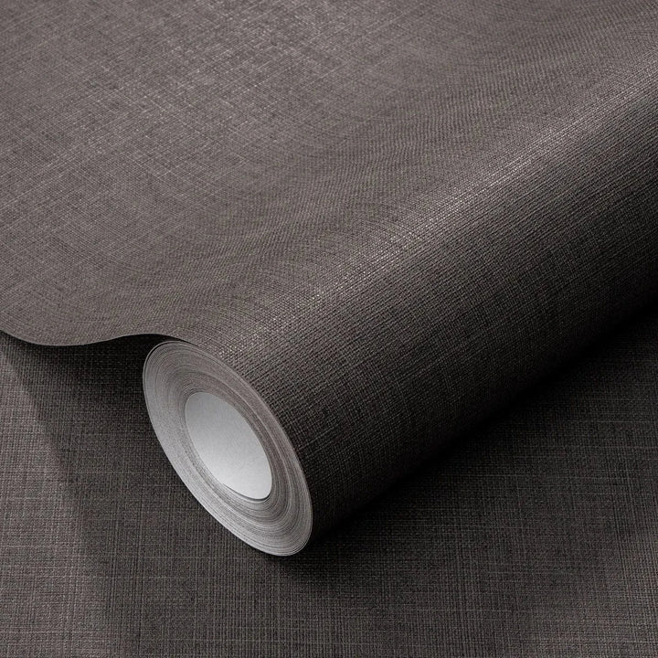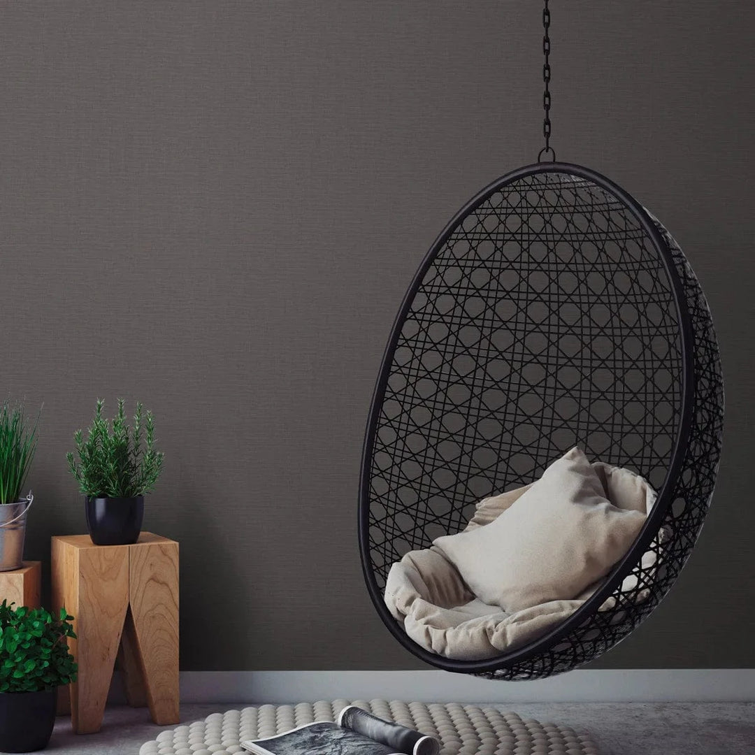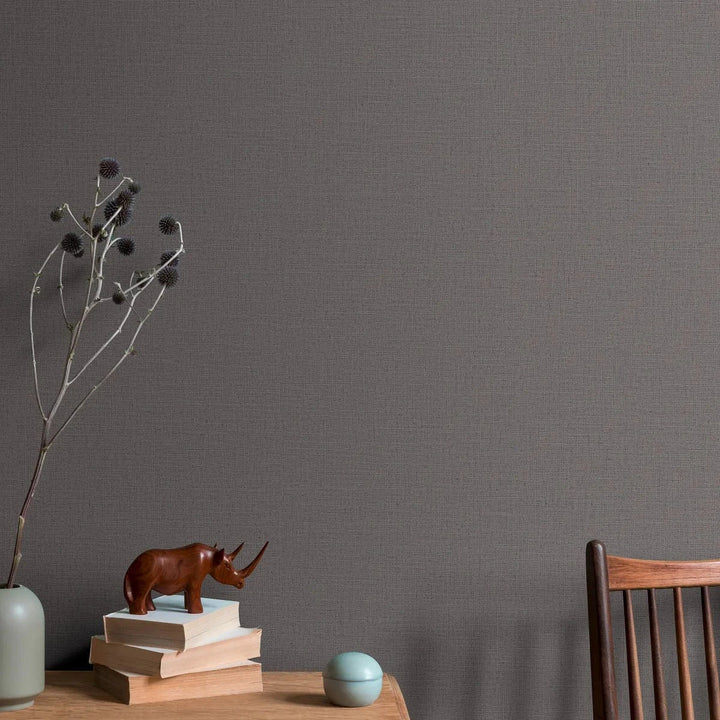 Tumši brūnas matētas tapetes ar auduma faktūru rada klasisku un greznu noskaņu.