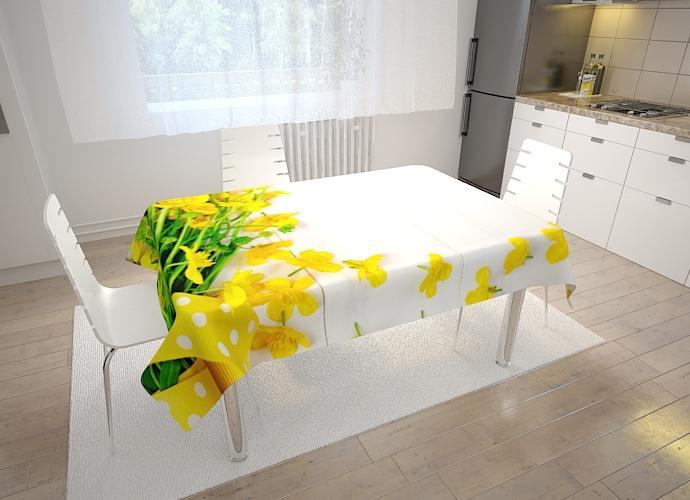 Galdauts ar dzelteniem ziediem uz balta fona