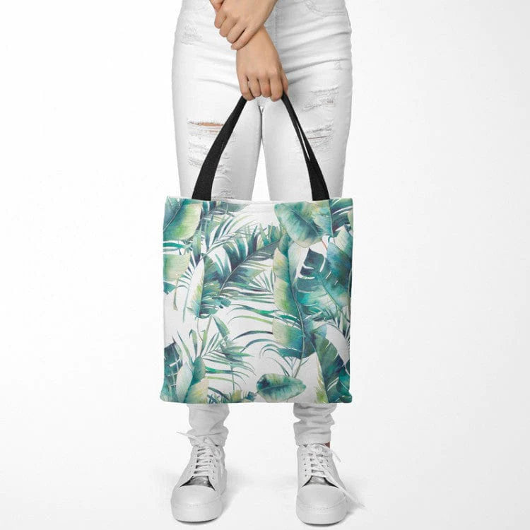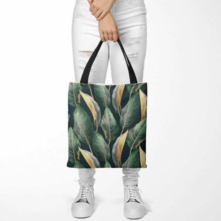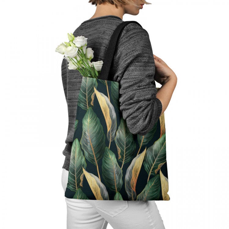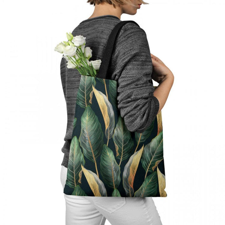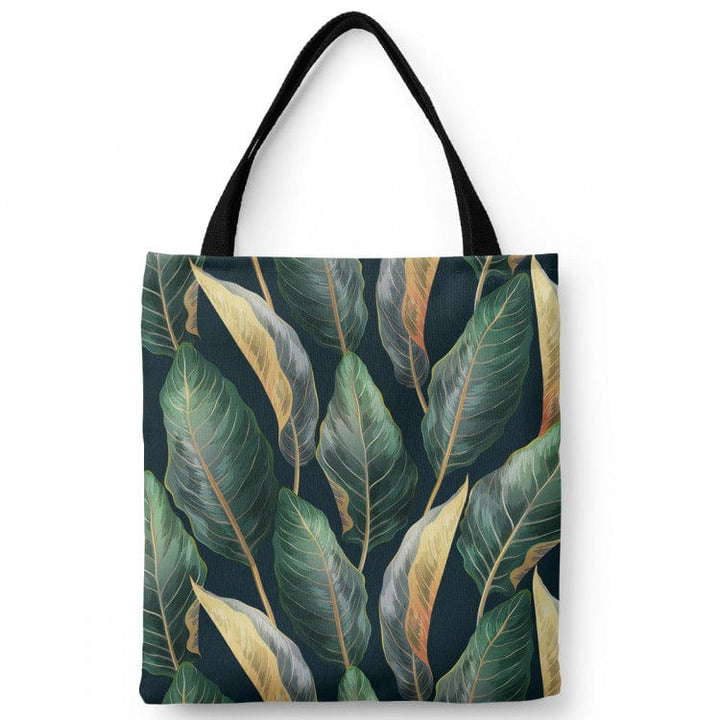 Iepirkumu maiss - Tropu raksts ar zaļam lapām un zeltu uz tumša fona, 147544