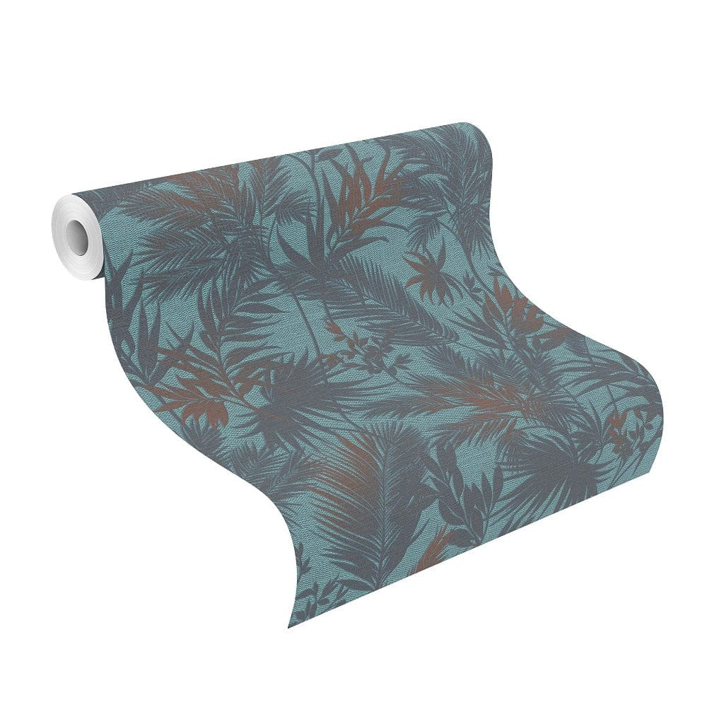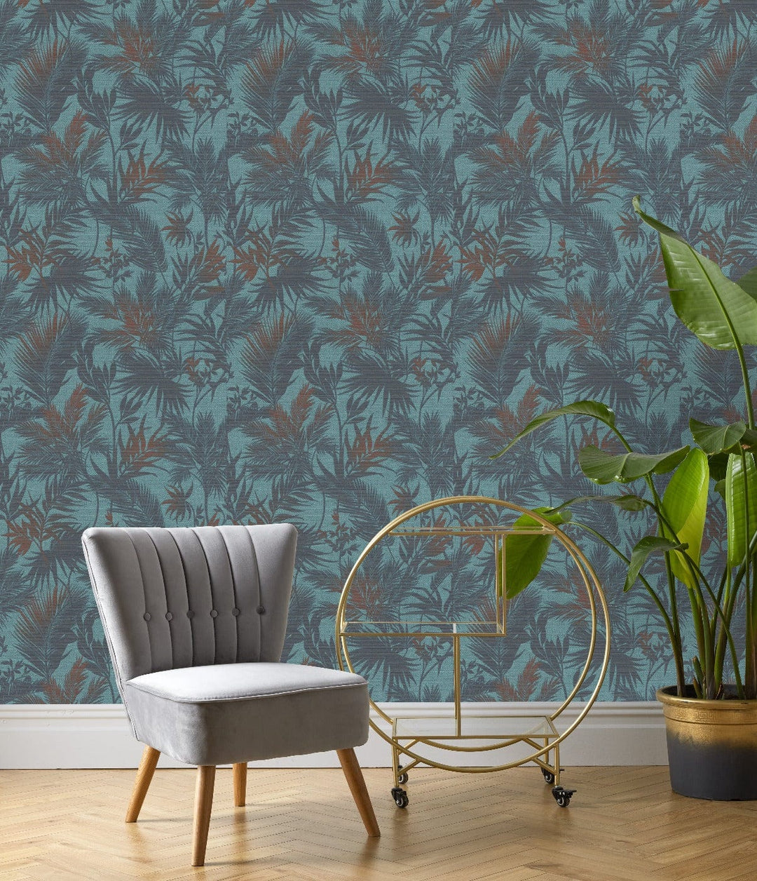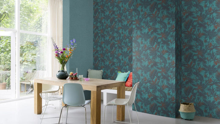 Izveidojiet eksotisku oāzi savā dzīvojamā istabā uz jebkuras sienas ar flizelīna tapetēm. Dažādu faktūru mijiedarbība ir tikpat meistarīga kā spīduma un matējuma efekts. Fonu veido tirkīza fons ar izteiksmīgu faktūru. Palmu lapu un zālaugu daudzveidība ir attēlota elegantā pusnakts zilā krāsā ar vieglu, relaksējošu faktūru. Nejaušs sarkans mirdzums padara šo sienas dekoru perfektu.