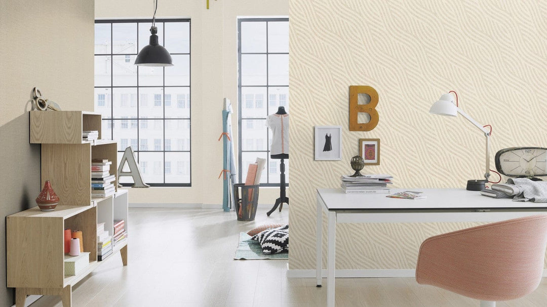 Abstraktās smilšu sanesas dažkārt iet viena blakus otrai, dažkārt viena virs otras, radot jebkurā telpā graciozu dinamiku un spilgtu formu saspēli. Uz krēmīgi balta fona ar auduma tekstūrai līdzīgu faktūru vienmērīgas līnijas virpuļo visos virzienos siltā gaiši bēšā krāsā. Tas garantē patīkamu atmosfēru.
