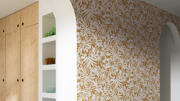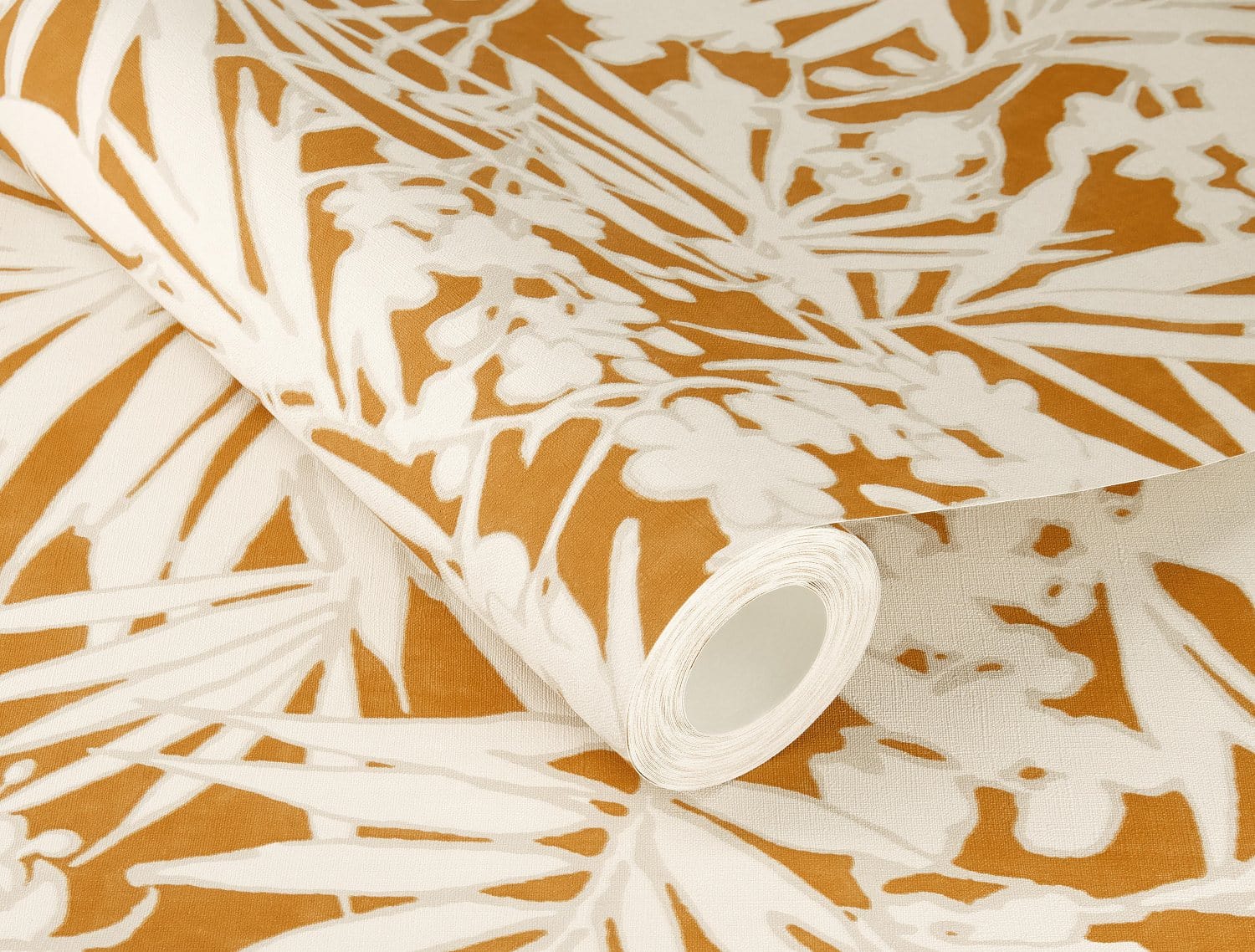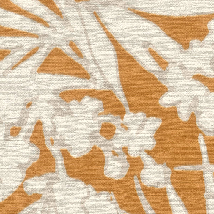 Tapetes ar tropiskām lapām uz tekstila faktūras, oranža un krēmkrāsa, RASCH, 1205130
