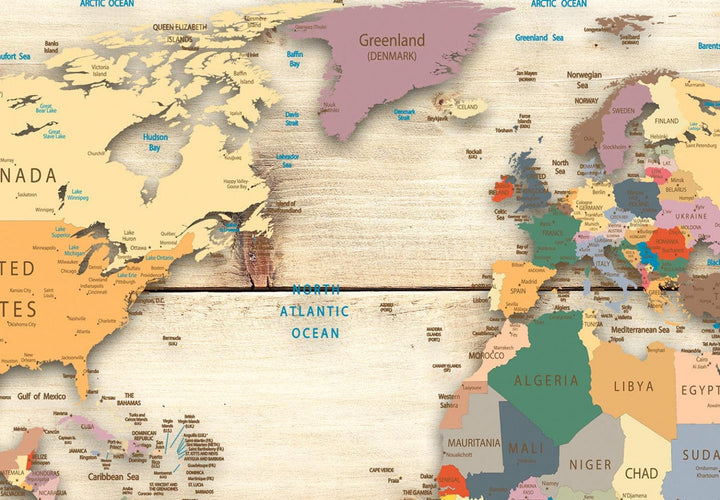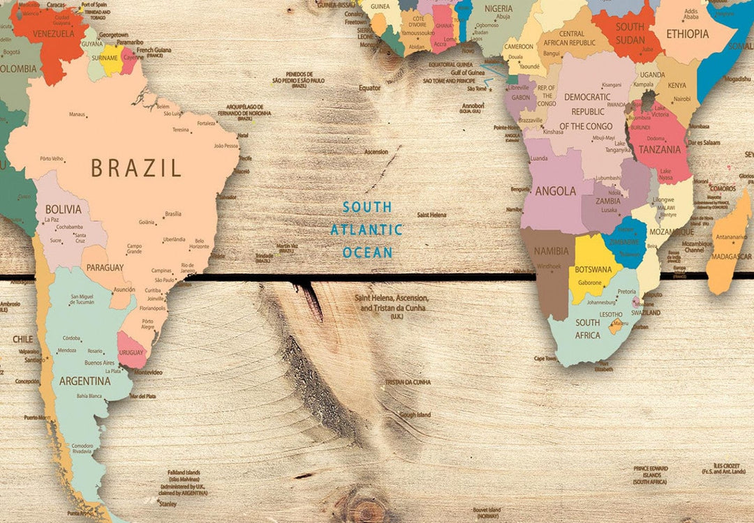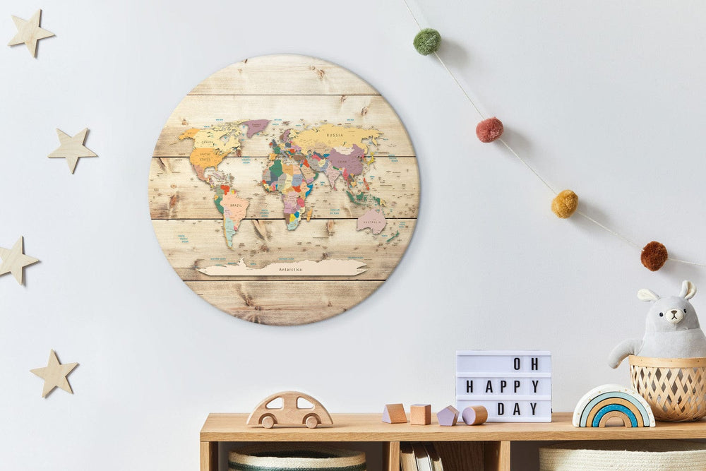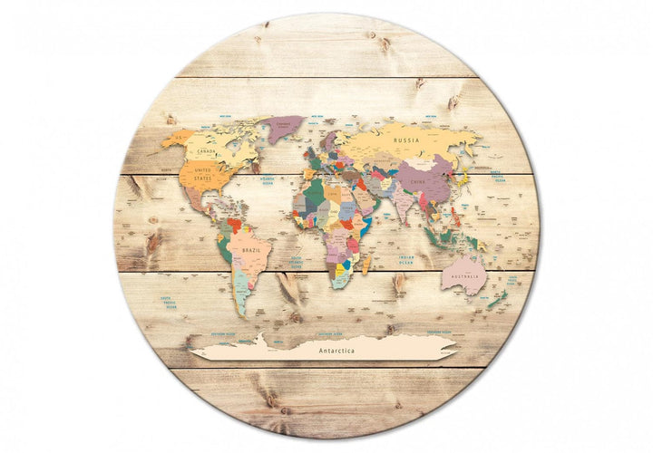 Apaļa kanva (Deluxe) - Pasaules karte - krāsaini kontinenti uz koka dēļiem, 148727
