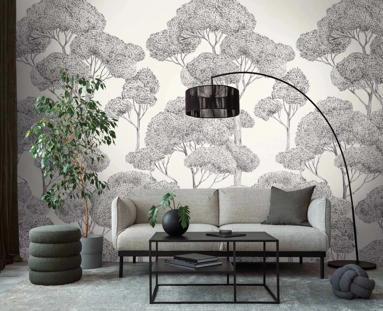 Šo tapetes rakstu raksturo smalki izstrādāti koki ar blīvu, nedaudz apmākušos lapotni. Ilustrācija izskatās kā detalizēts tušas zīmējums, kurā neskaitāmas smalkas līnijas veido koku lapu struktūru un rada apjomu. Krāsu gamma ir melnbalta, kas motīvam piešķir elegantu, atturīgu pieskārienu un izsaka retro estētiku klasisko dabas pētījumu stilā. Rāmās līnijas un krāsu trūkums padara ainavu gaisīgu un vieglu, bet koku vainagu raksts rindā telpai piešķir dabisku harmoniju un dziļumu. Dizains izstaro modernas vienkāršības un mūžīgas tuvības dabai kombināciju.
