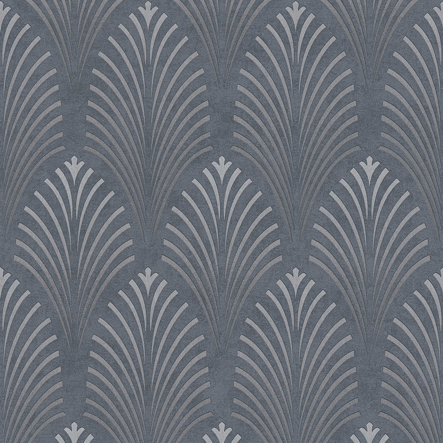 Tekstila tapetes ar klasisku ornamentu, sudrabs uz tumši pelēka