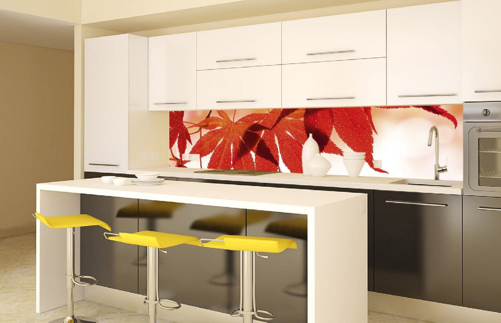 Pašlīmējošas fototapetes virtuvei - Sarkanās lapas  (260x60 cm) Art4home