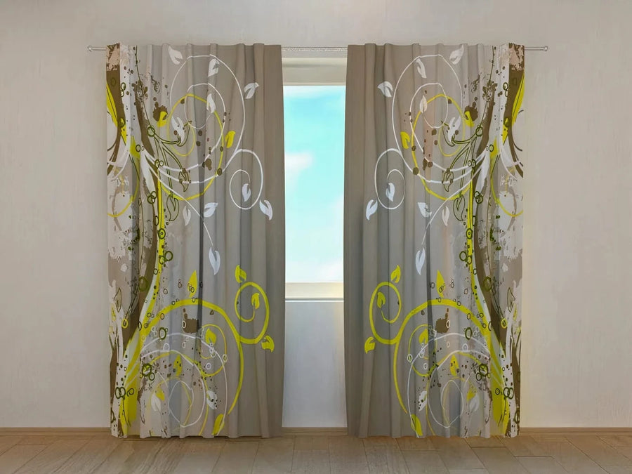 Dienas un nakts aizkari ar modernu rakstu – stilizētas lapas uz brūna fona Tapetenshop.lv