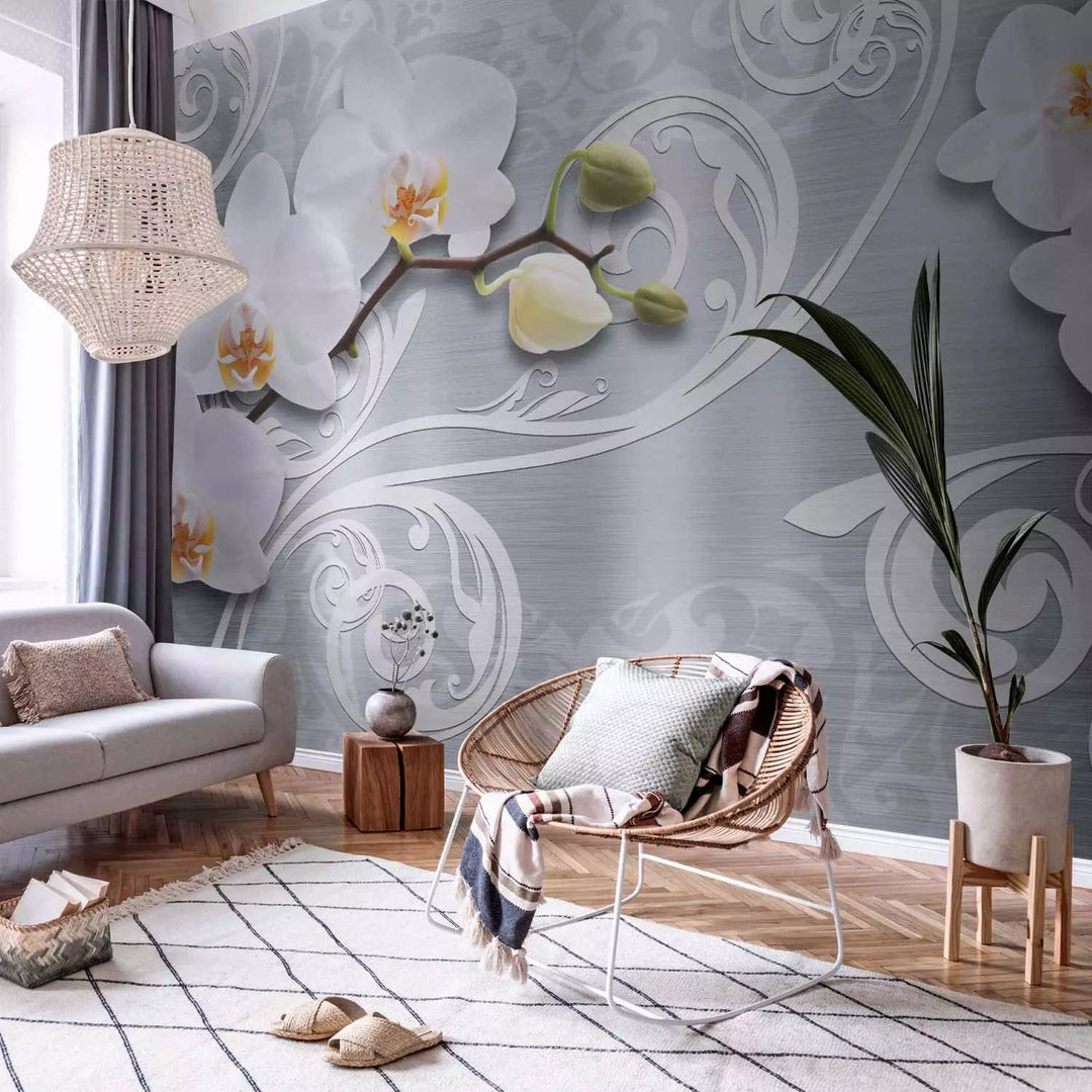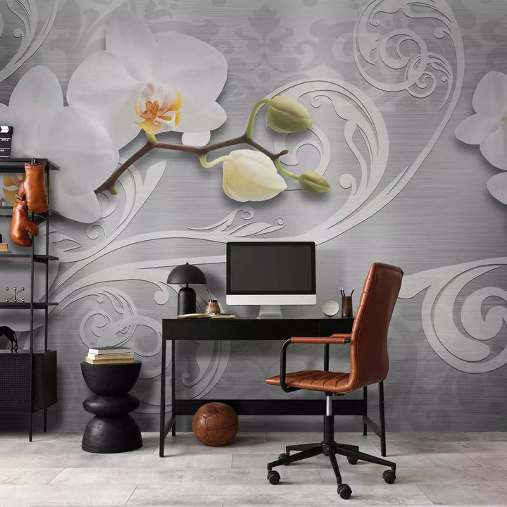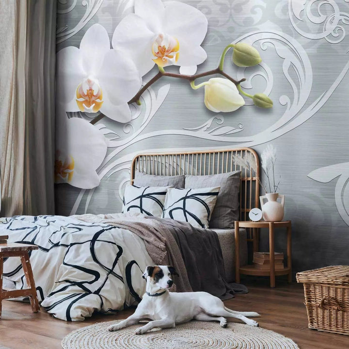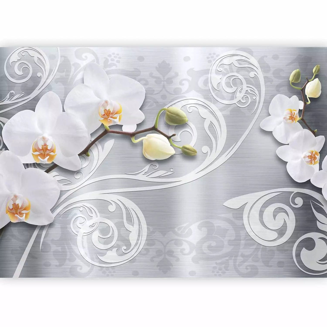 Fototapetes - Orhideju ziedi uz sudraba fona, 60268
