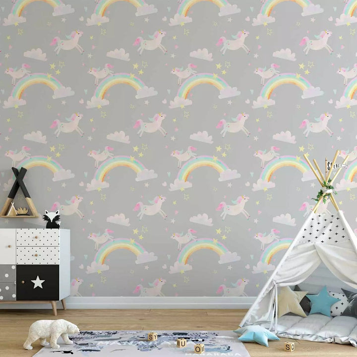 Laipni lūdzam brīnumu pasaulē ar "Pasaku Sapņi" tapetēm no Tapetenshop. Šīs tapetes ir ideāls veids, kā pārvērst jūsu bērna istabu par pasaku valstību. Skaistajā pelēkajā un rozā fonā ir attēloti burvīgi vienradži, varavīksnes un zvaigznītes, kas noteikti iepriecinās jebkuru bērnu.