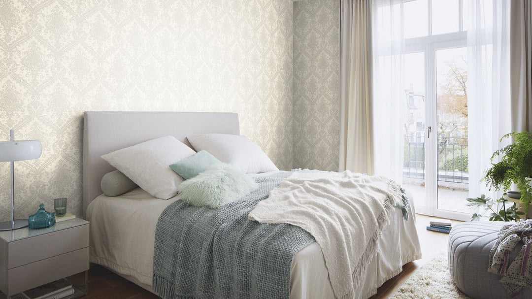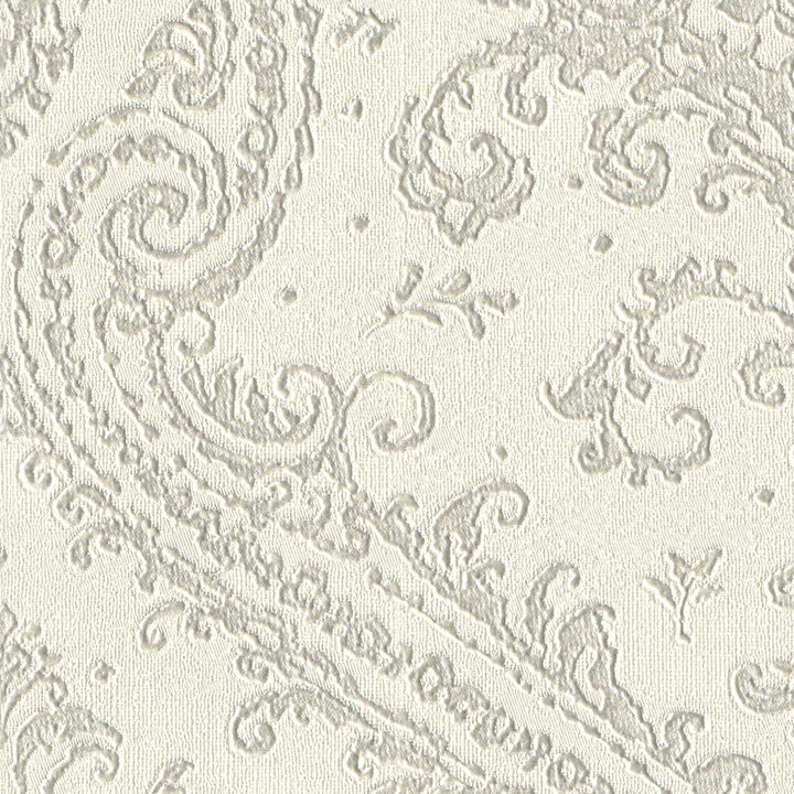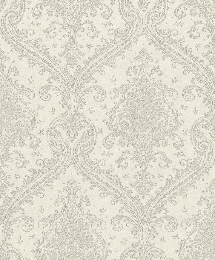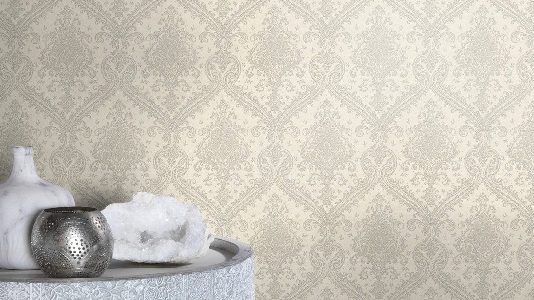 Šīs baroka tapetes dizains balstās uz sulīgu ornamentu. Tā izceļas ar sudraba mirdzumu uz gaiši krēmīgi balta fona.