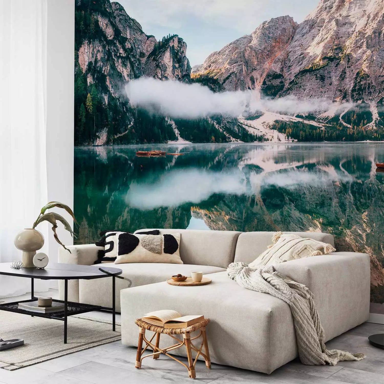 Fototapetes - Ainava ar koka māju un laivām uz kalnu fona, 150968