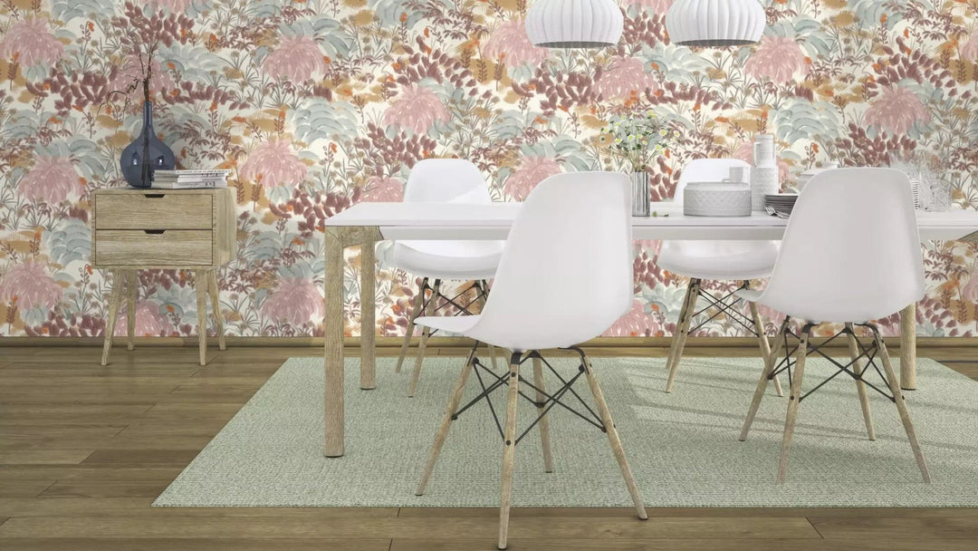 Ar šo neausto tapeti uz sienas uzplaukst burvīgs dārzs maigās un košās krāsās, pārvēršot jebkuru telpu pasaku pasaulē. Raksts izskatās kā aizraujoša skice, kas uzgleznota ar maigām akvareļkrāsām. Baltais fons ar smalku faktūru rada poētisku ainavu, kas apbur ar savu harmonisko skaistumu.
