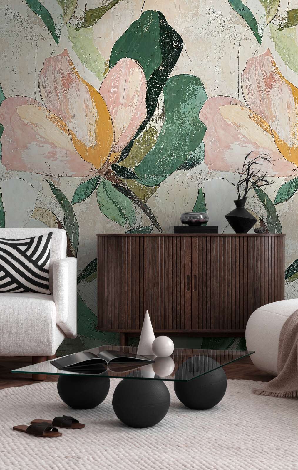 Motīvu raksturo lieli ziedu motīvi ar stilizētu vintage raksturu. Galveno lomu spēlē lielizmēra magnolijas ziedi delikātos rozā un krēmkrāsas toņos ar siltu aprikožu nokrāsu centrā. Starp tiem izplešas dažāda izmēra lapas, dažkārt pārklājoties, sūnu zaļā, olīvu un tumši egļu zaļā krāsā. Virsmā redzams apzināti radīts novecojums: tekstūras un plaisas, it kā tapetes būtu nolietotas vai izbalējušas gadu gaitā, piešķir tām burvīgu, nedaudz nolietotu izskatu. Fons paliek smalkā smilšu vai kaļķakmens krāsā un uzsver dabisko, zemes eleganci. Kopumā raksts rada mierīgu, botānisku atmosfēru ar nostalģisku noskaņu, kas padara gan dzīvojamās telpas, gan radošās darba zonas pievilcīgas un mākslinieciskas.