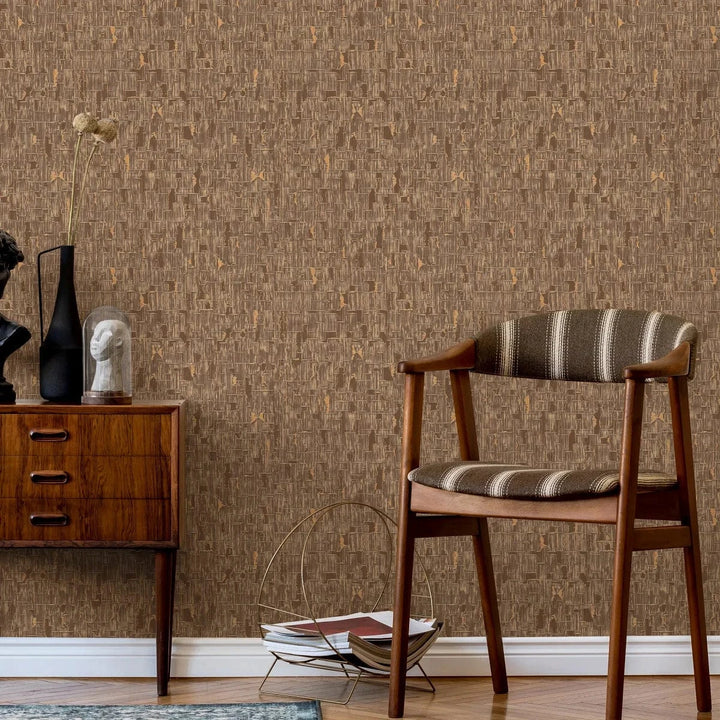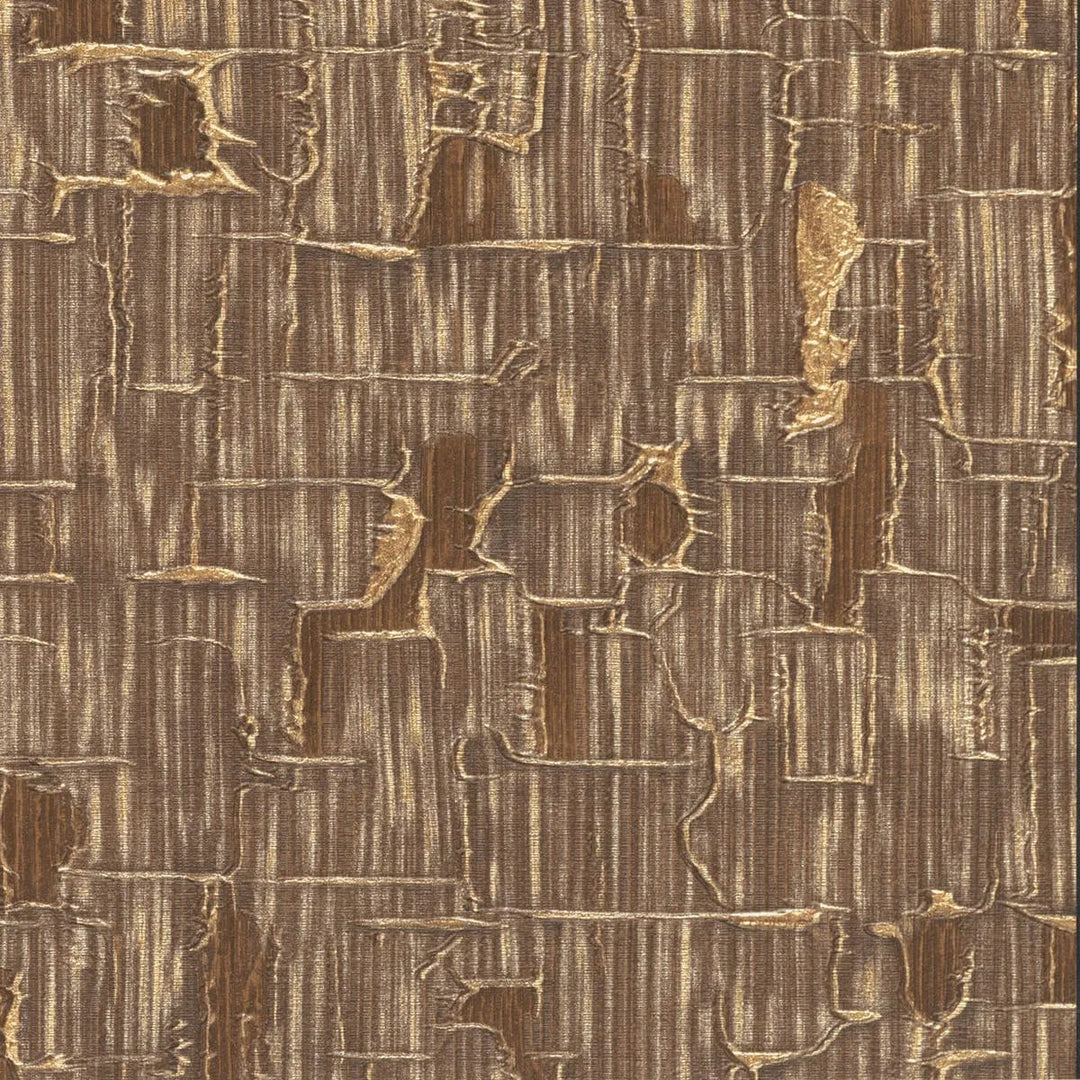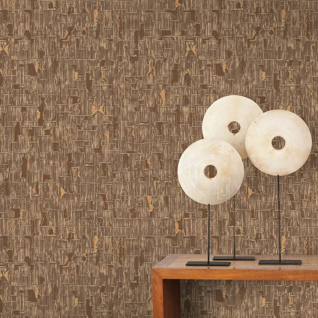 Brūni un zelta dizaina tapetes ar abstraktu rakstu piešķir sienām greznu un elegantu akcentu