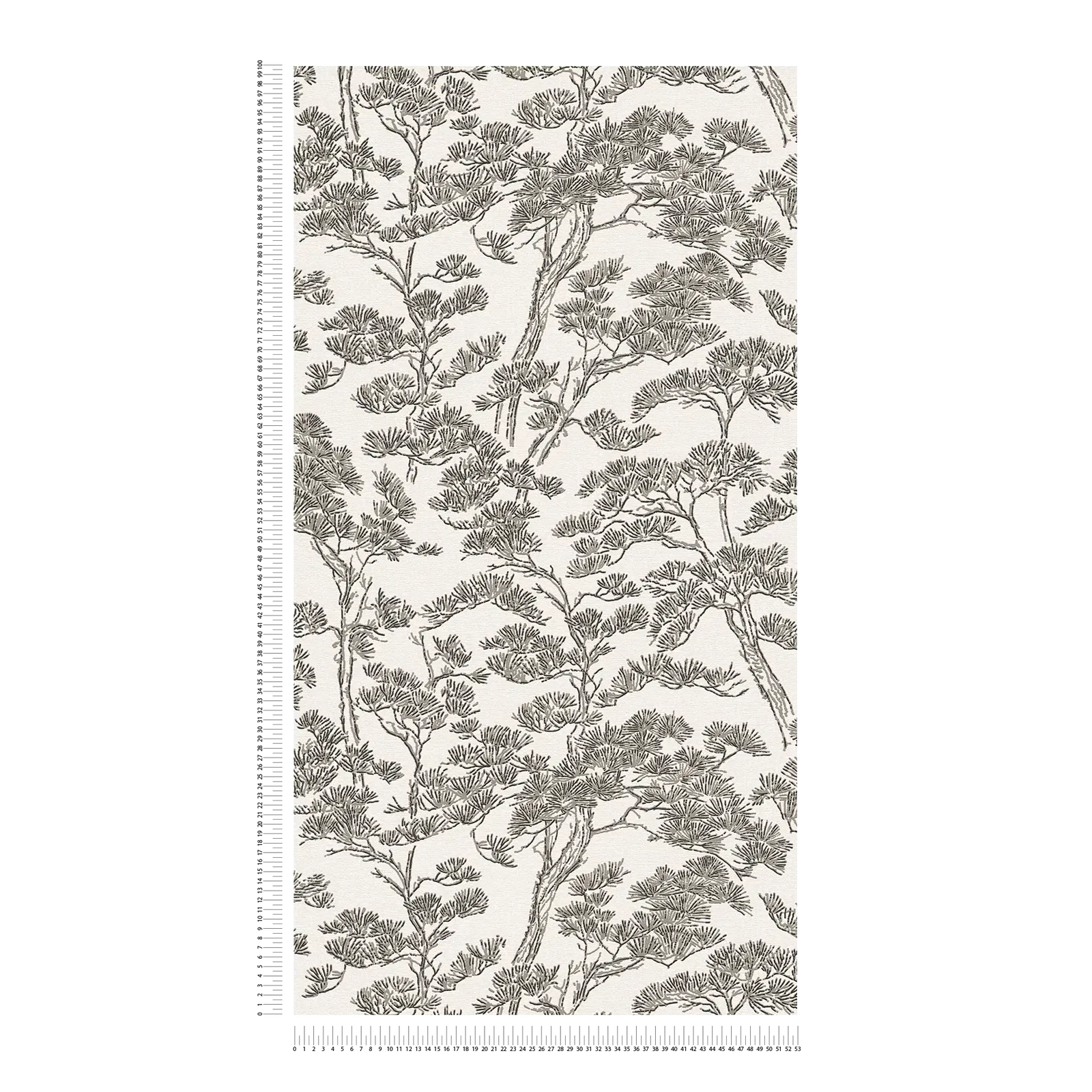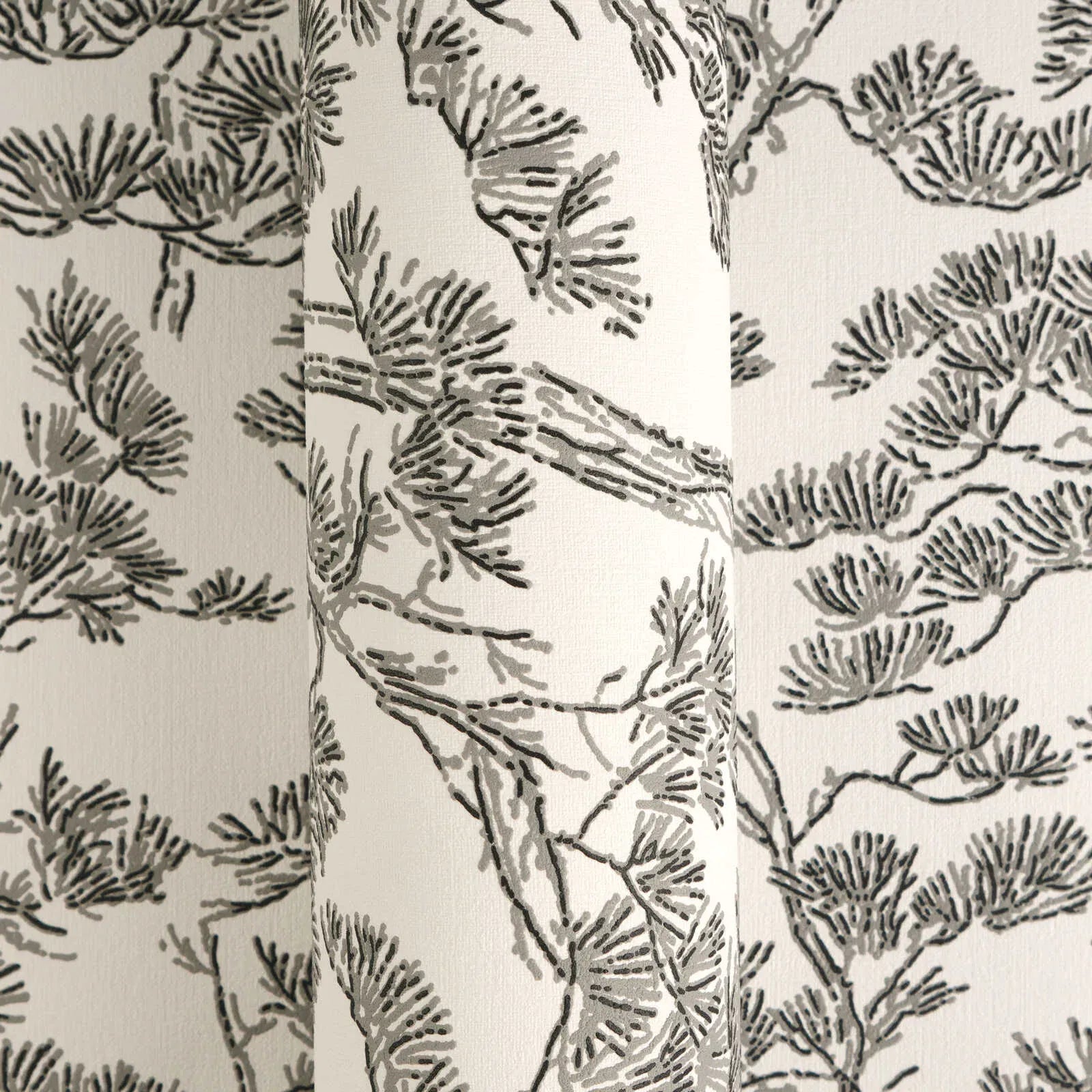 Sarežģīti koku un zaru motīvi atkārtojas uz krēmkrāsas fona. Atsevišķie koki izskatās kā stilizētas priedes ar izliektām, smalki izstrādātām skujām un eleganti izliektām zarām. Attēls ir grafisks, gandrīz atgādina tušas zīmējumu, ar skaidrām līnijām dažādos pelēkos toņos. Raksts piešķir kopējam attēlam mierīgu, smalku un tomēr dabisku efektu. Ierobežotā krāsu gamma pelēkbrūnā un baltā krāsā piešķir tapetēm mūžīgu izskatu un padara telpas atvērtas un gaišas, vienlaikus motīvs izstaro harmoniju, maigumu un smalku eleganci.