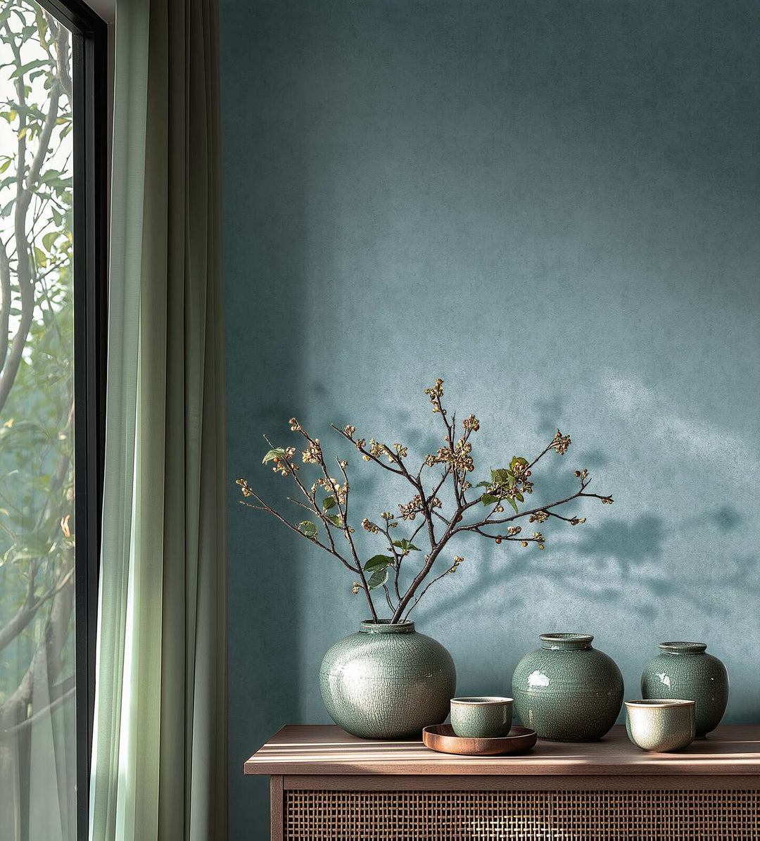 No gaiši zaļajām tapetēm ar delikātu spīdumu un smalku faktūru līdz maigajām zilajām tapetēm ar apmetuma efektu un metāla nokrāsu — katrs šīs kolekcijas elements apvieno taktilu pievilcību ar mierīgu krāsu paleti. Kolekcijā ir arī betona efektu tapetes spīdīgā zilā krāsā, kas piešķir urbānu eleganci, un modernas vienkrāsainas zilas tapetes ar smalku, neuzkrītošu faktūru — ideālas minimālisma stilā ieturētiem, bet siltu interjeru veidošanai.