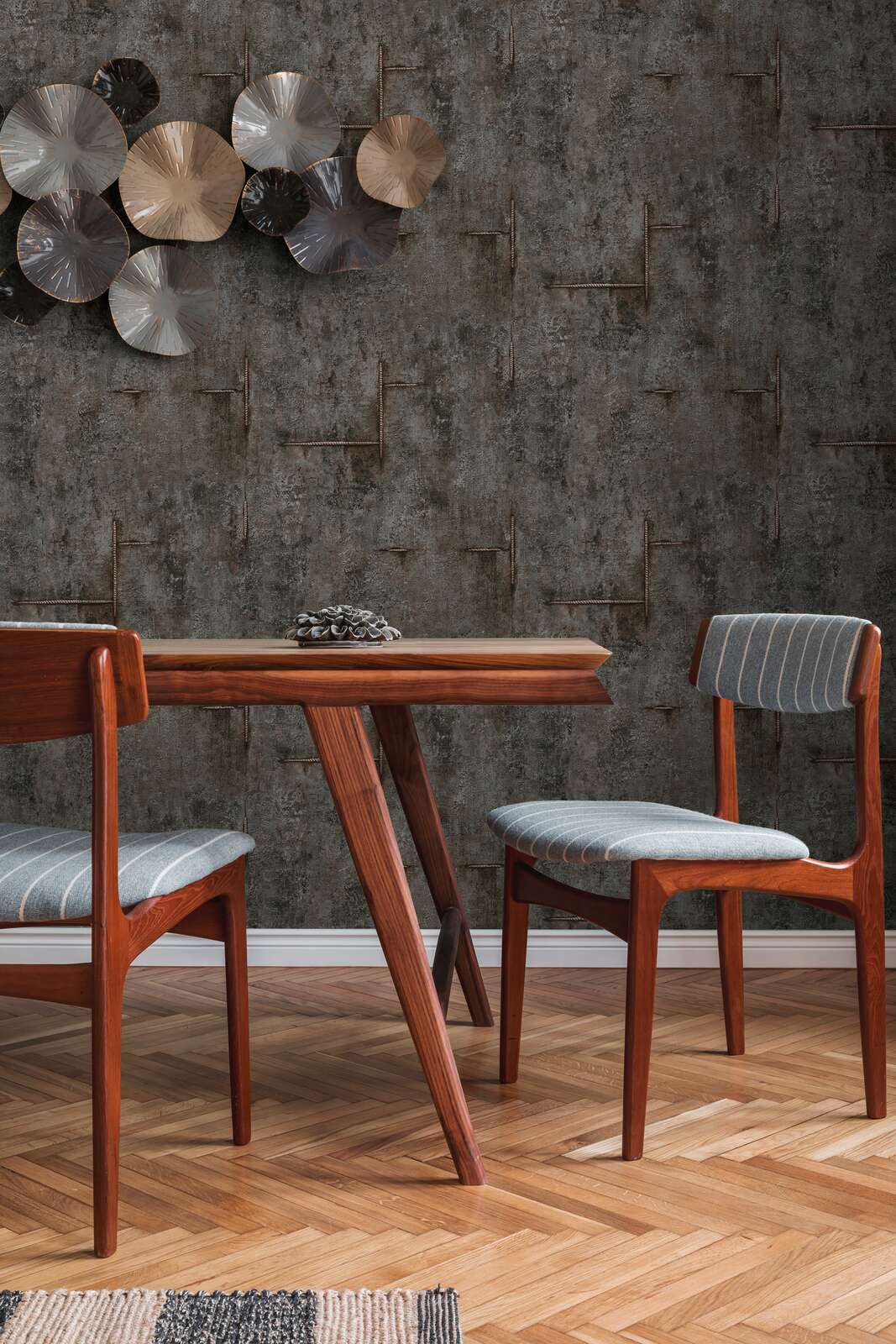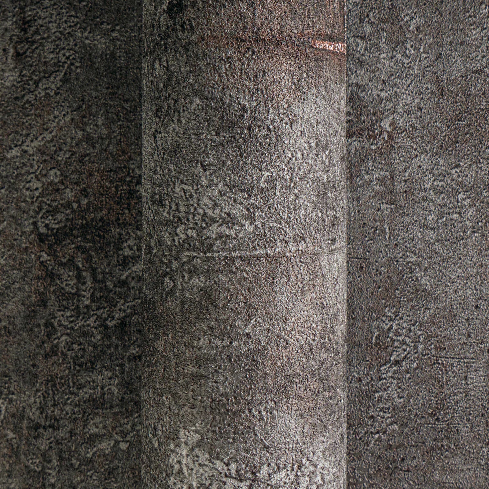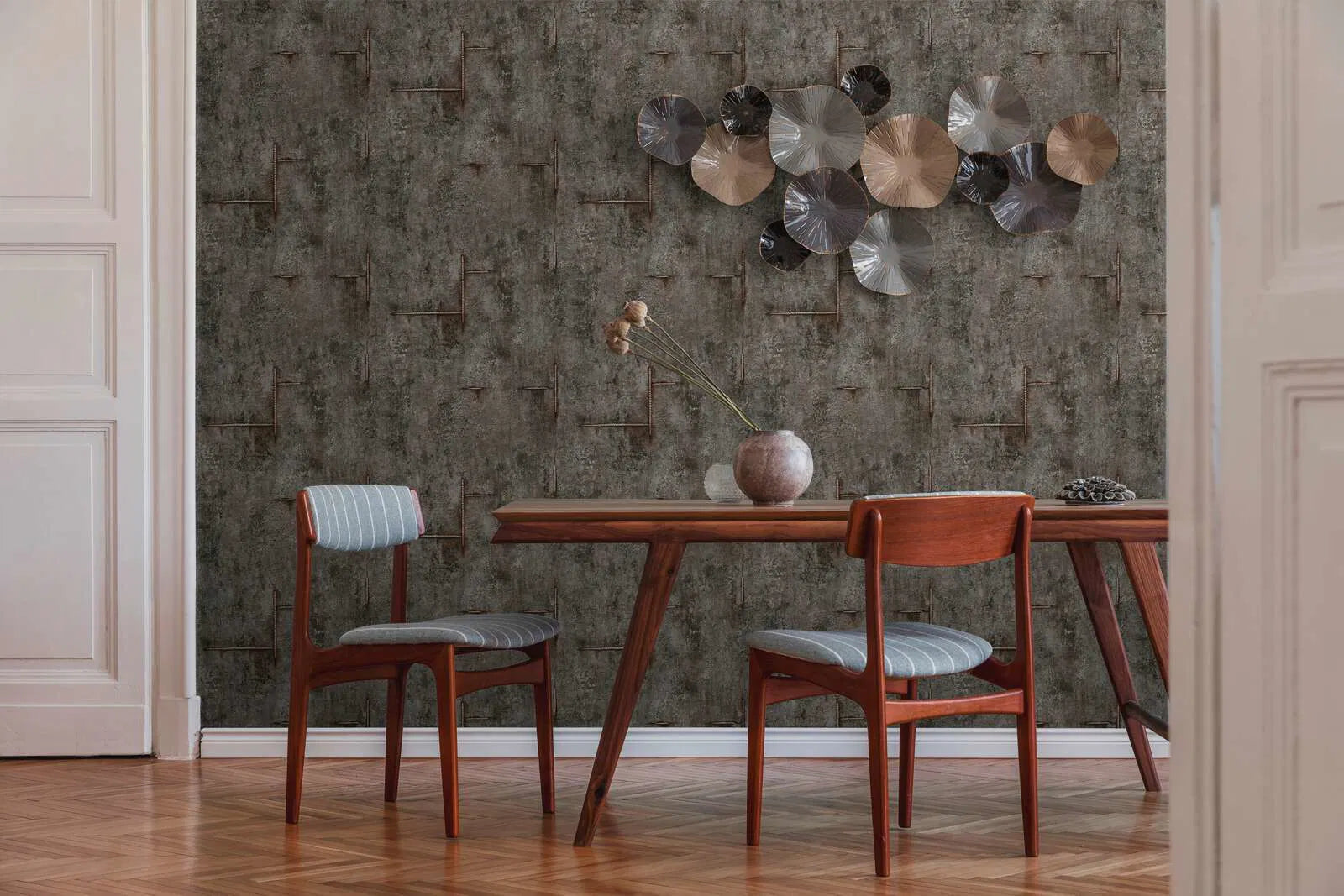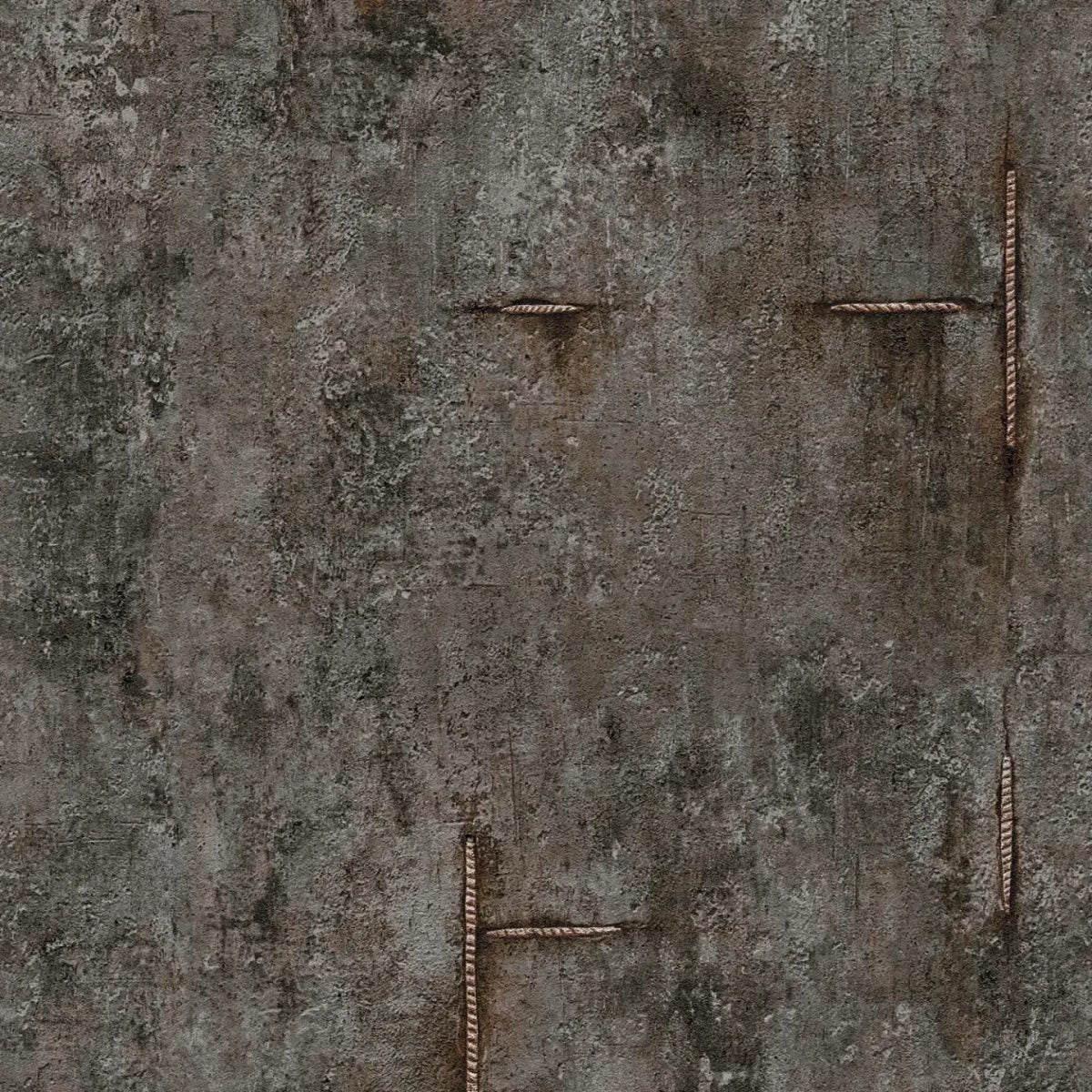 Tapetes motīvs attēlo rupji teksturētu virsmu, kas ļoti atgādina neapstrādātu, novecojušu atklātu betonu. Visai virsmai raksturīga niansēta matēti pelēko, zemes toņu un nedaudz rūsainu akcentu mijiedarbība, kas dizainam piešķir industriālu, raupju raksturu. Horizontāli un vertikāli elementi armatūras stieņu veidā pārtrauc rakstu neregulāros intervālos – tie izskatās trīsdimensiju, it kā metāls būtu patiešām iegults betonā. Armatūras krāsa ir starp vara un rūsainu brūnu un kontrastē ar vēso, trauslo fonu. Kopējais izskats ir gan robusts, gan autentisks, radot modernu, urbānu atmosfēru un asociācijas ar loftu vai rūpnīcu arhitektūru. Tapetes telpai piešķir vīrišķīgu, spēcīgu un māksliniecisku pieskārienu.