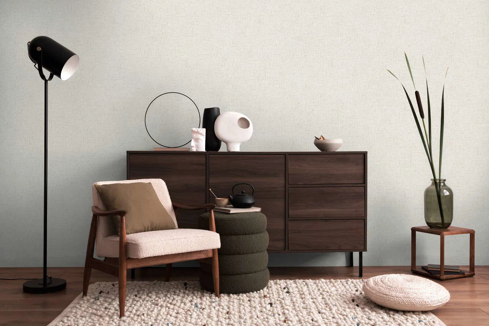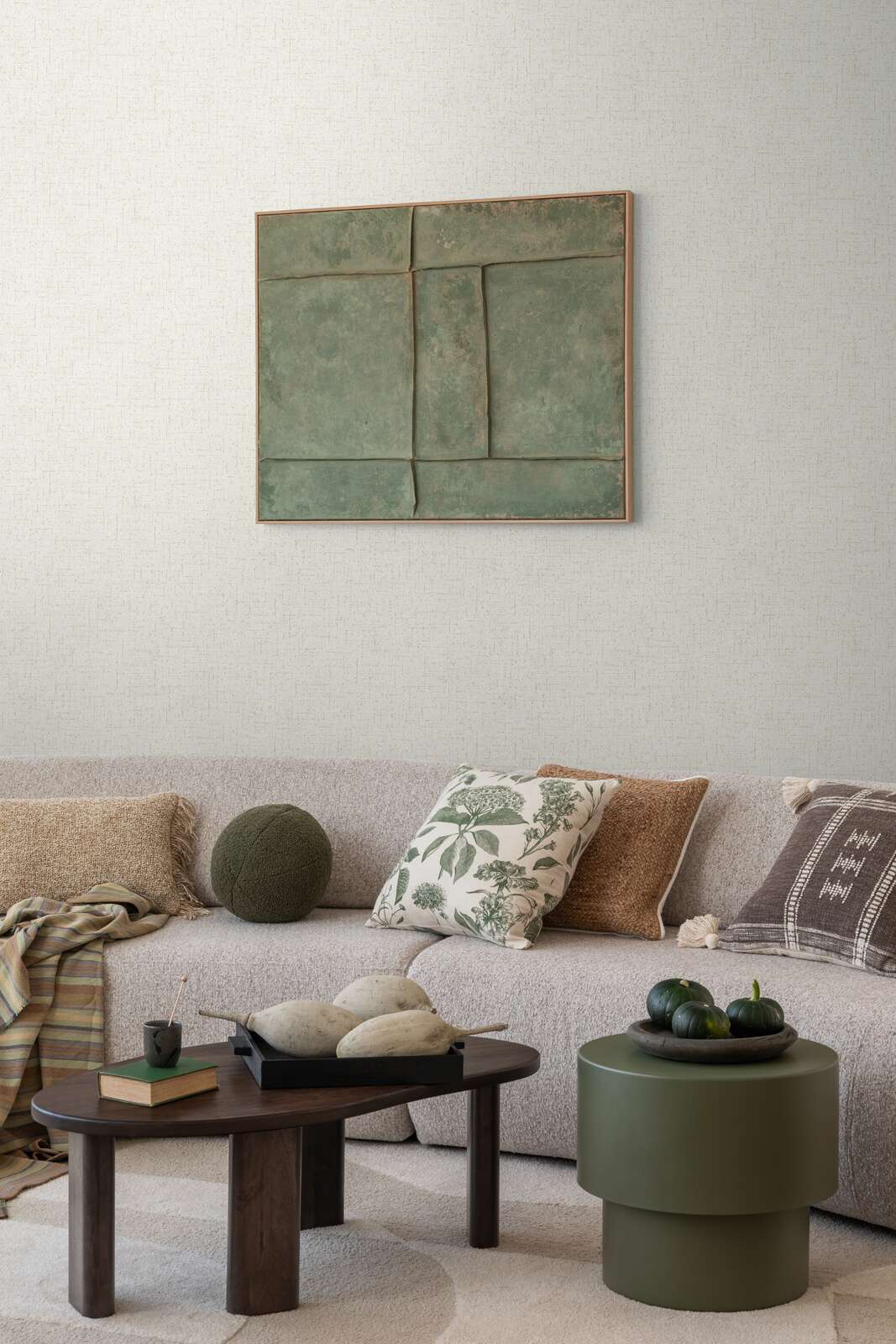 Šo tapetu motīvs ir izsmalcināts, tekstilam līdzīgs raksts uz maigas, siltas krēmkrāsas fona. Smalki, neregulāri gaiši smilškrāsas līnijas horizontāli un vertikāli šķērso virsmu, radot brīvu, režģveida efektu, kas atgādina smalki austu linu. Raksts izskatās atturīgs, gaišs un mūžīgs, radot mierīgu un mājīgu atmosfēru. Krāsu gamma ir neitrāla, dabiska, kas telpu padara draudzīgu un gaišu un labi saderīgu ar dažādiem mēbeļu stiliem. Teksturētais stils un delikātā krāsu kombinācija piešķir tapetēm elegantu vienkāršību ar mājīgu sajūtu.