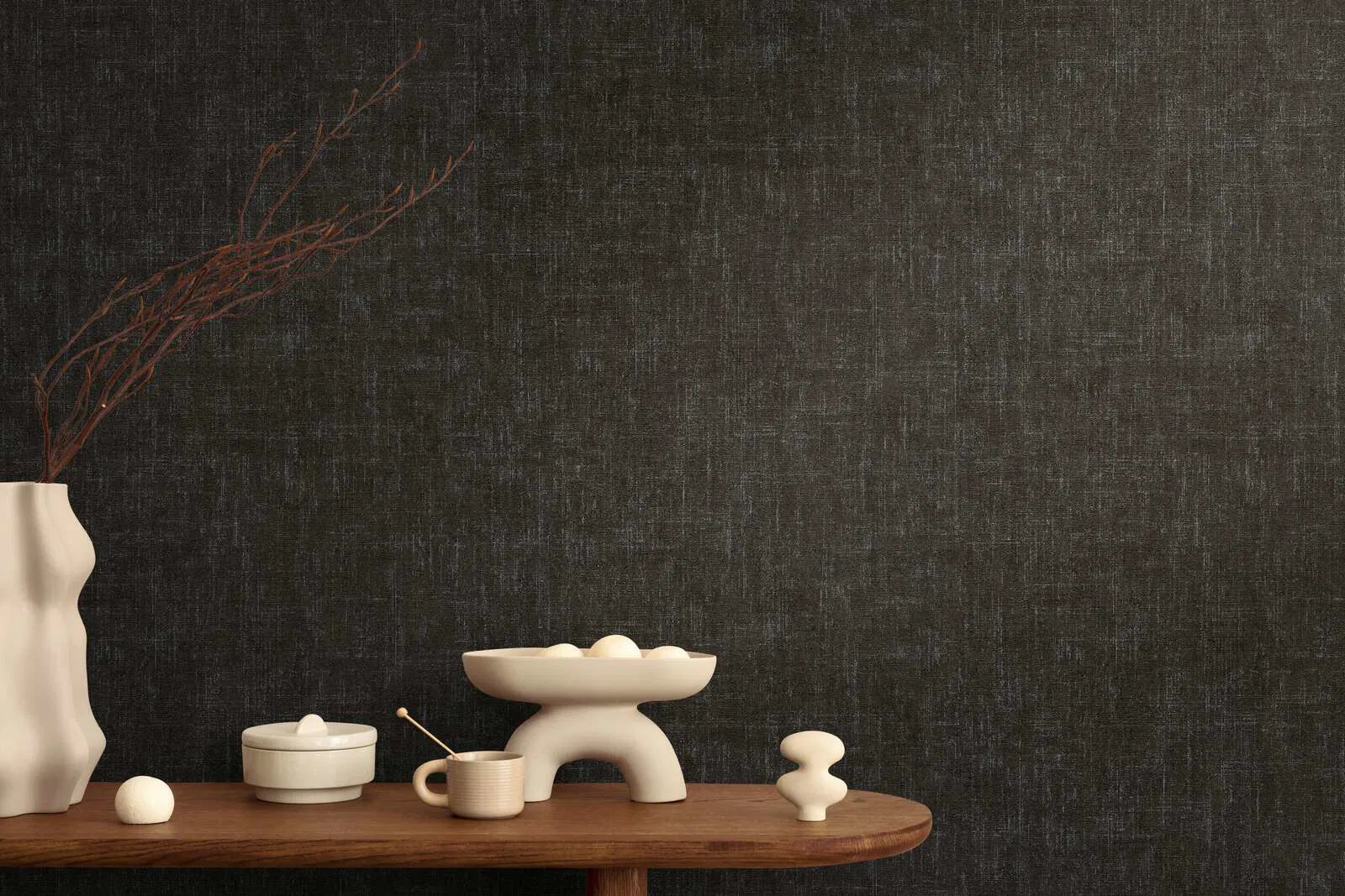 Šīs tapetes dominē tumši, bagātīgi brūni toņi, kas pateicoties savai atturīgajai krāsu gammai rada mierīgu un elegantu atmosfēru. Raksts atgādina smalkas, krustveida līnijas, kas atgādina lina struktūru vai rupji austu tekstilmateriālu. Sudraba, pelēkā mirdzošā nokrāsa vietām sadala tumšo fonu un rada smalku, gandrīz industriālu izskatu. Kopumā dizains izskatās moderns un urbāns, bet vienlaikus arī silts un mājīgs, pateicoties tā materiālam. Smalkais raksts piešķir virsmai dziļumu un nodrošina, ka tapetes izskatās dzīvīgas un daudzveidīgas, neskatoties uz tumšo toni.