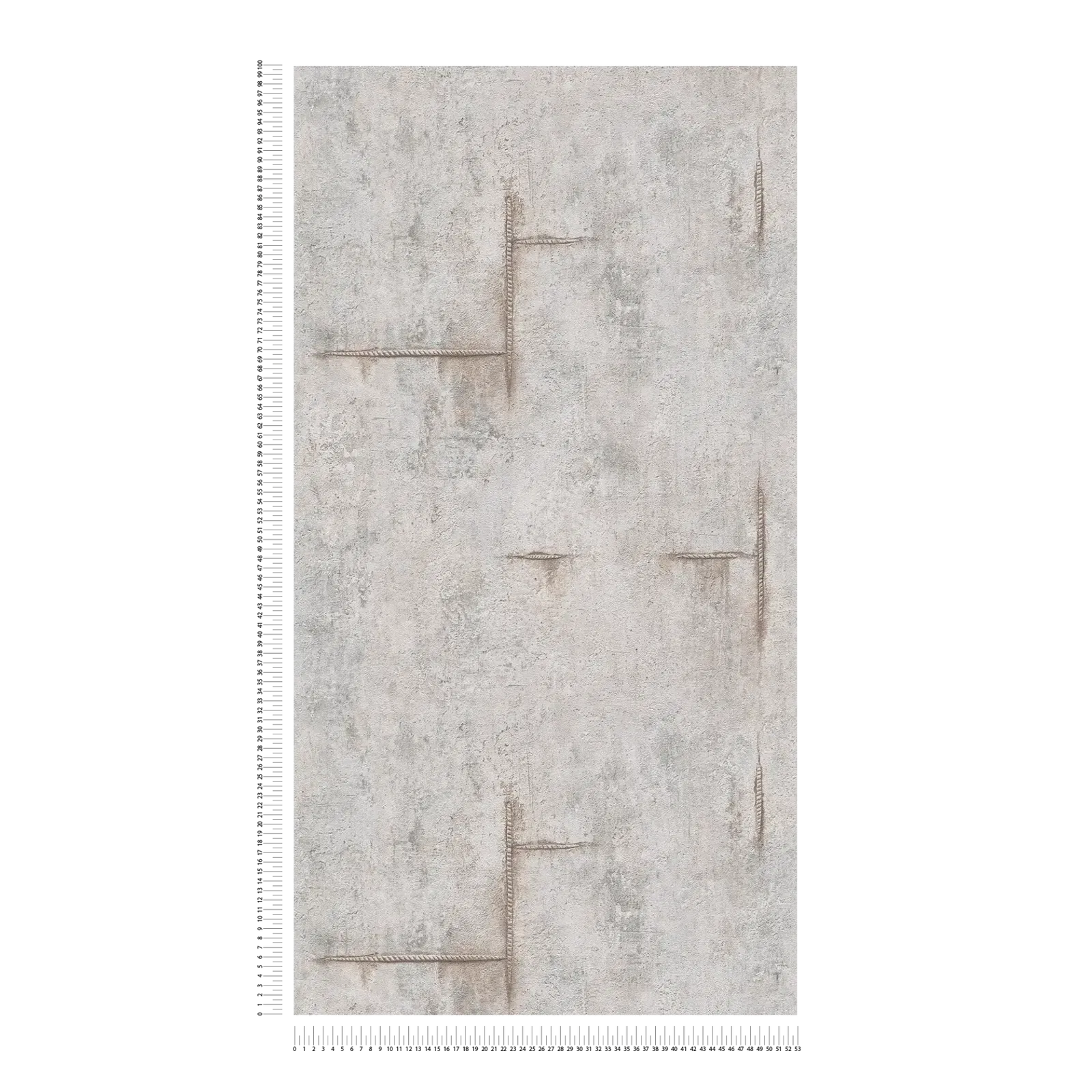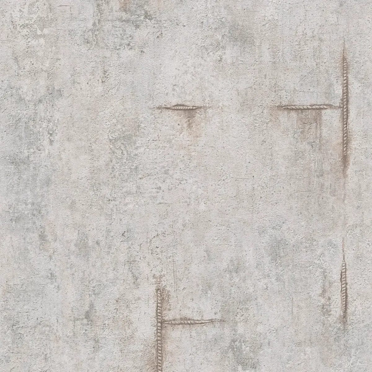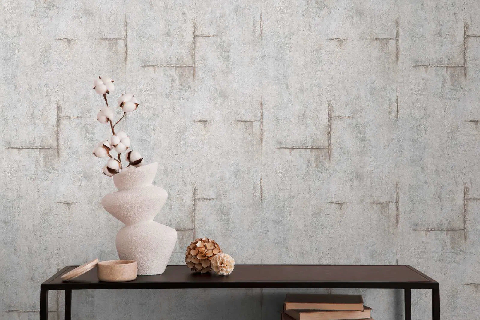 Tapetes raksts ir ar smalku, raupju virsmu, galvenokārt gaišos, klusos pelēkos un smilškrāsas toņos, kas atgādina nokaltušu betonu vai apmetumu. Krāsu gamma ir atturīga un neitrāla, bet tekstūra atgādina matētu un nedaudz spīdīgu virsmu maisījumu. Virsmu atkārtoti pārtrauc smalkas, lineāras reljefas: horizontālas un vertikālas līnijas, kas izskatās kā reljefas zīmes un atgādina metāla bruņas, piešķir tapetēm industriālu raksturu. Līnijas ir nedaudz rūsainas, brūngani pelēkas, izskatās kā roku darbs un uzsver lietoto izskatu. Kopumā rezultāts ir moderns, urbāns stils ar smalku vintage pieskaņu, kas telpai piešķir mierīgu, bet dzīvīgu atmosfēru.