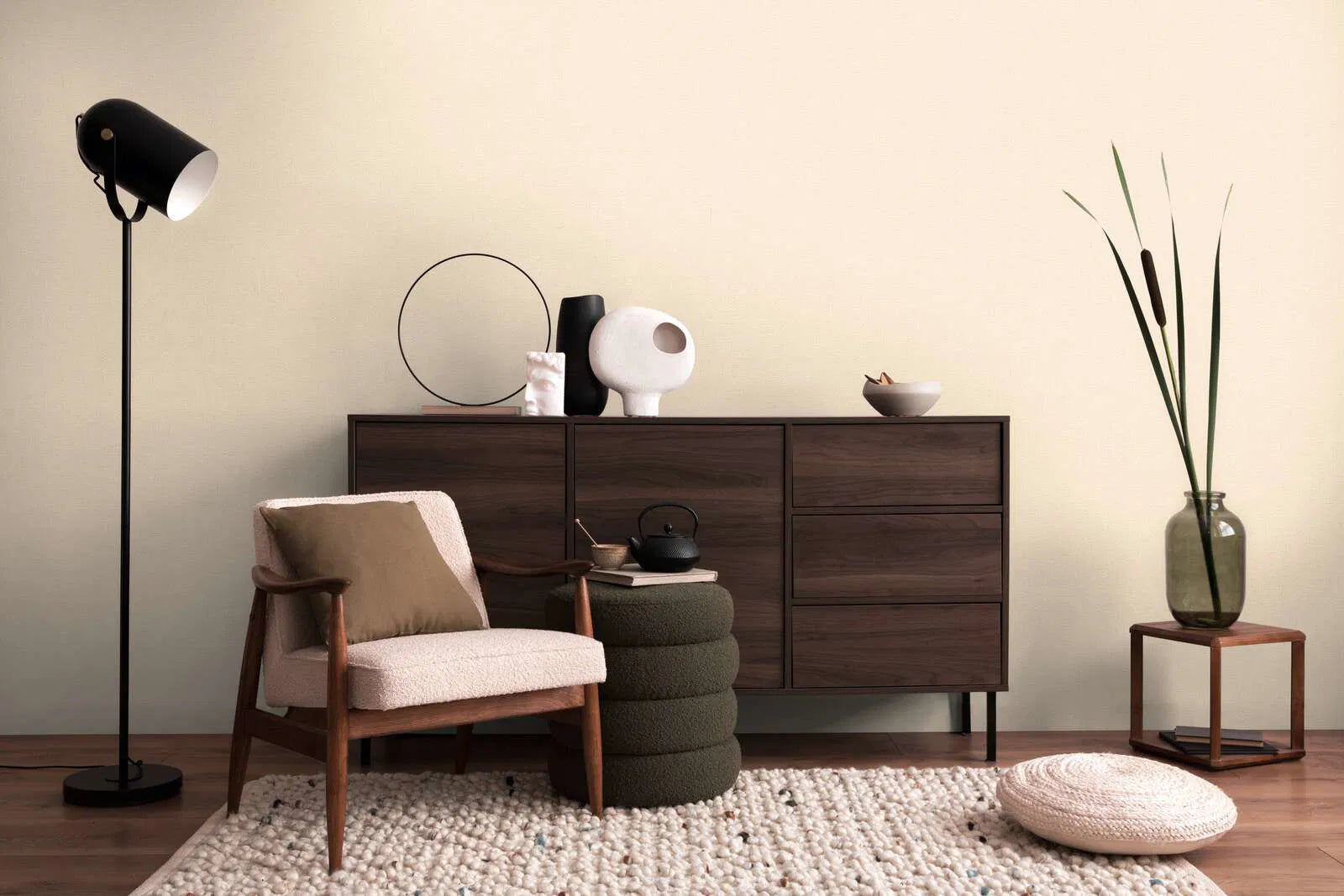 Motīvs attēlo ļoti smalku, neuzkrītošu tapeti gaiši krēmkrāsā. Virsmā redzams viegli teksturēts audums vai smalks lins, ko norāda smalks, neregulārs līniju raksts. Šī tekstūra padara tapetes dabiskas un mājīgas, neuzbāzīgas. Krāsu gamma ir vienkrāsaina, sākot no ziloņkaula krāsas līdz smilšu un bēša krāsai, kas telpai piešķir gaišumu un patīkamu siltumu. Stils ir mūžīgs un elegants, ideāli piemērots gan moderniem, gan klasiskiem interjeriem, un tā atturība rada mierīgu, harmonisku atmosfēru.