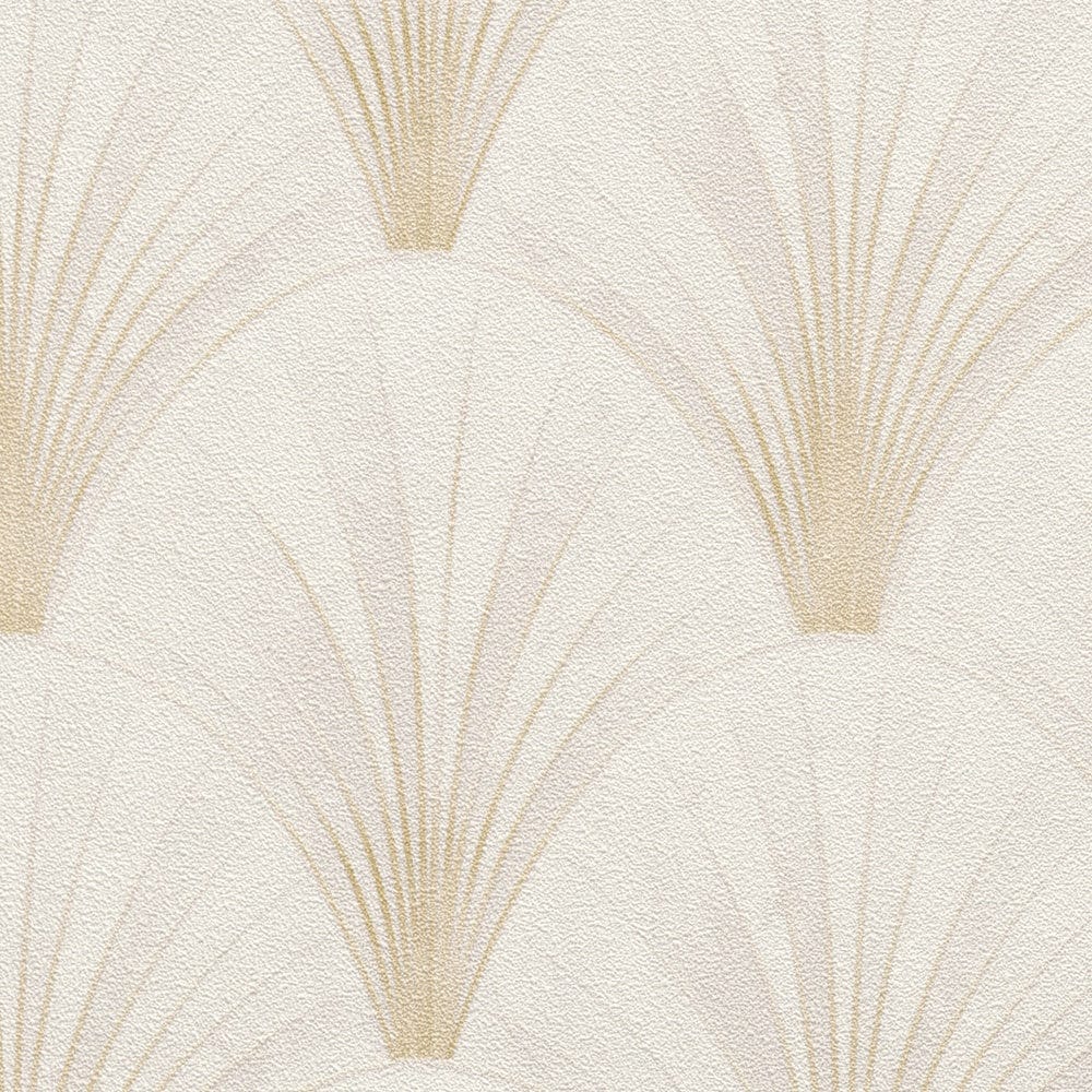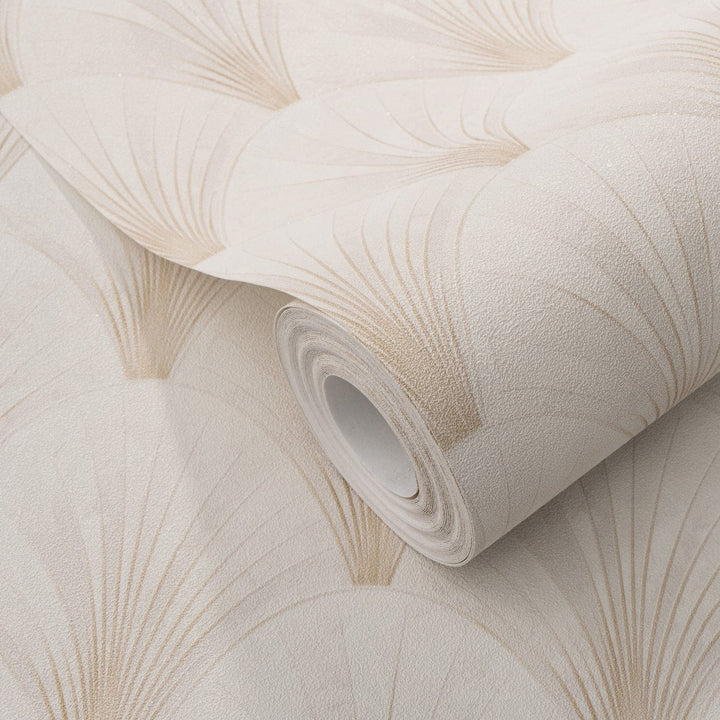 Harmonisks bēša un krēmkrāsas krāsu apvienojums piedāvā maigu, bet vienlaikus strukturētu ikoniskā vēdekļveida raksta interpretāciju. Maigais kontrasts un smalkais mirdzums piešķir dziļumu un siltumu, radot izsmalcinātu fonu, kas šķiet gan senatnīgs, gan mūsdienīgs.