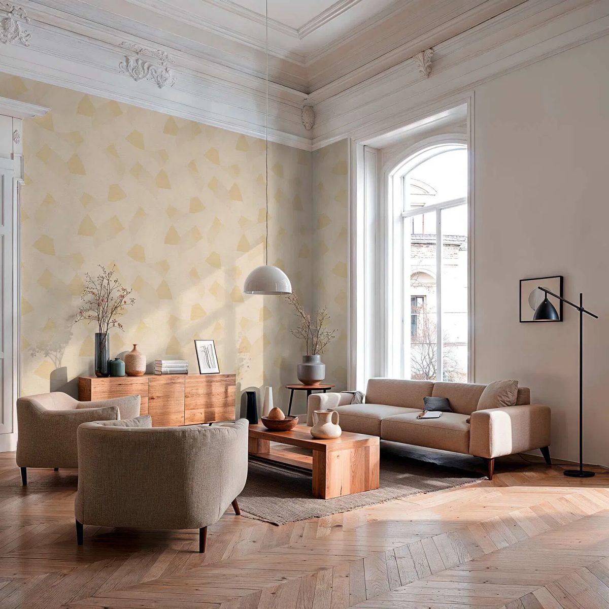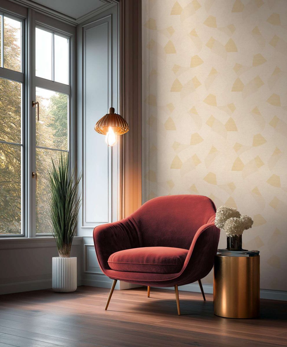 Ar vieglu spīdumu un smalku faktūru šīs tapetes telpai piešķir patīkamu atmosfēru. Tās ir viegli uzklājamas, ievērojot 64 cm raksta atkārtojumu taisnā līnijā, kas nodrošina perfektu zīmējuma saskaņošanu. Tapetes ir izturīgas pret saules gaismu un augstas kvalitātes virsmu var tīrīt pat ar suku un ziepjūdeni. Noņemšana ir vienkārša – samērcējot ar ūdeni. Bēšā un krēmkrāsas toņu gamma rada harmonisku un siltu kopējo iespaidu. Rakstu veido pārklājošas ģeometriskas formas un apļveida segmenti, kuros regulāri ievijas smalkas līnijas. Tas rada aizraujošu kontrastu starp grafisko stingrību un maigām līknēm, izstarojot relaksētu modernitāti.