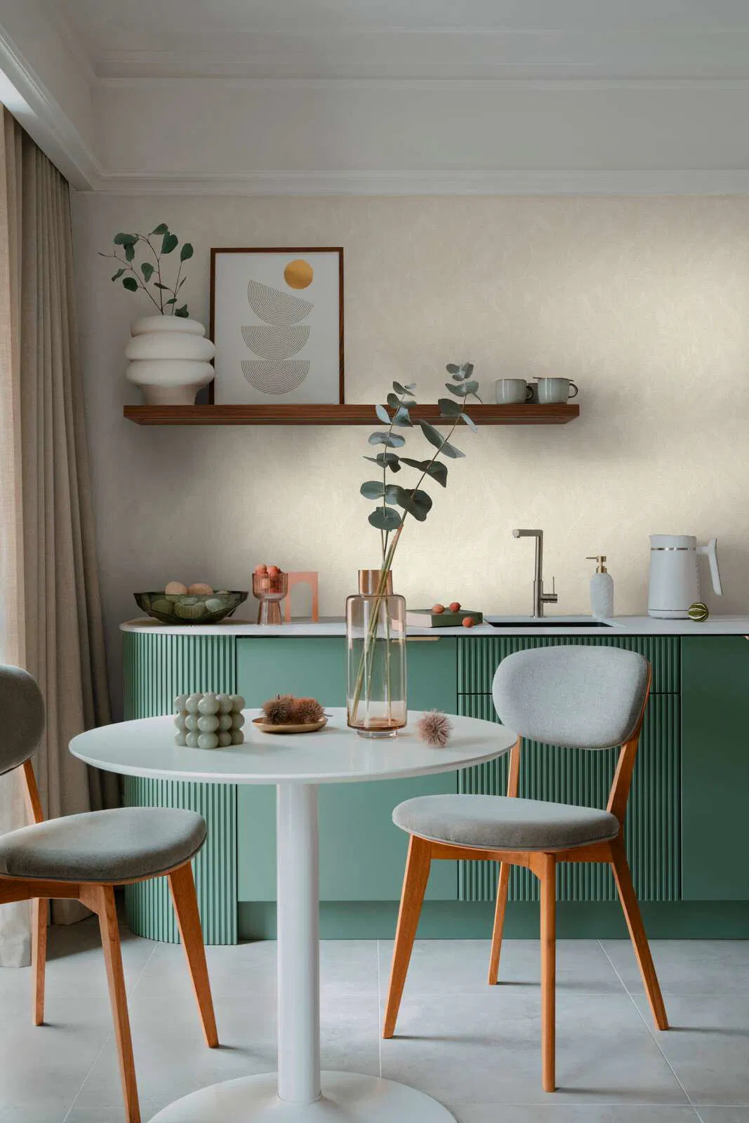 Tapetes, kas viegli pielāgojas ikdienas un ģimenes dzīvei: matēta virsma ar spīdīgu rakstu piešķir jebkurai telpai smalku šarmu, neuzspiežot sevi. Viegla tekstūra nodrošina patīkamu dzīves sajūtu, bet lieliska gaismas izturība un augsta nodilumizturība padara tapetes īpaši viegli kopjamas – krāsas paliek spilgtas pat spilgtā saules gaismā, un nelielus netīrumus var viegli noņemt ar ziepju ūdeni un suku. Pateicoties tapetes līmēšanas tehnikai, tapetes ir viegli uzklāt, un 64 cm atkārtojums ar taisnu līniju palīdz nodrošināt, ka raksts perfekti saderas. Noņemot tapetes, vienkārši samitriniet tās ar ūdeni, lai tās viegli noņemtu no sienas – praktiski mājīgai mājai, kas aug kopā ar katru jaunu dzīves posmu.