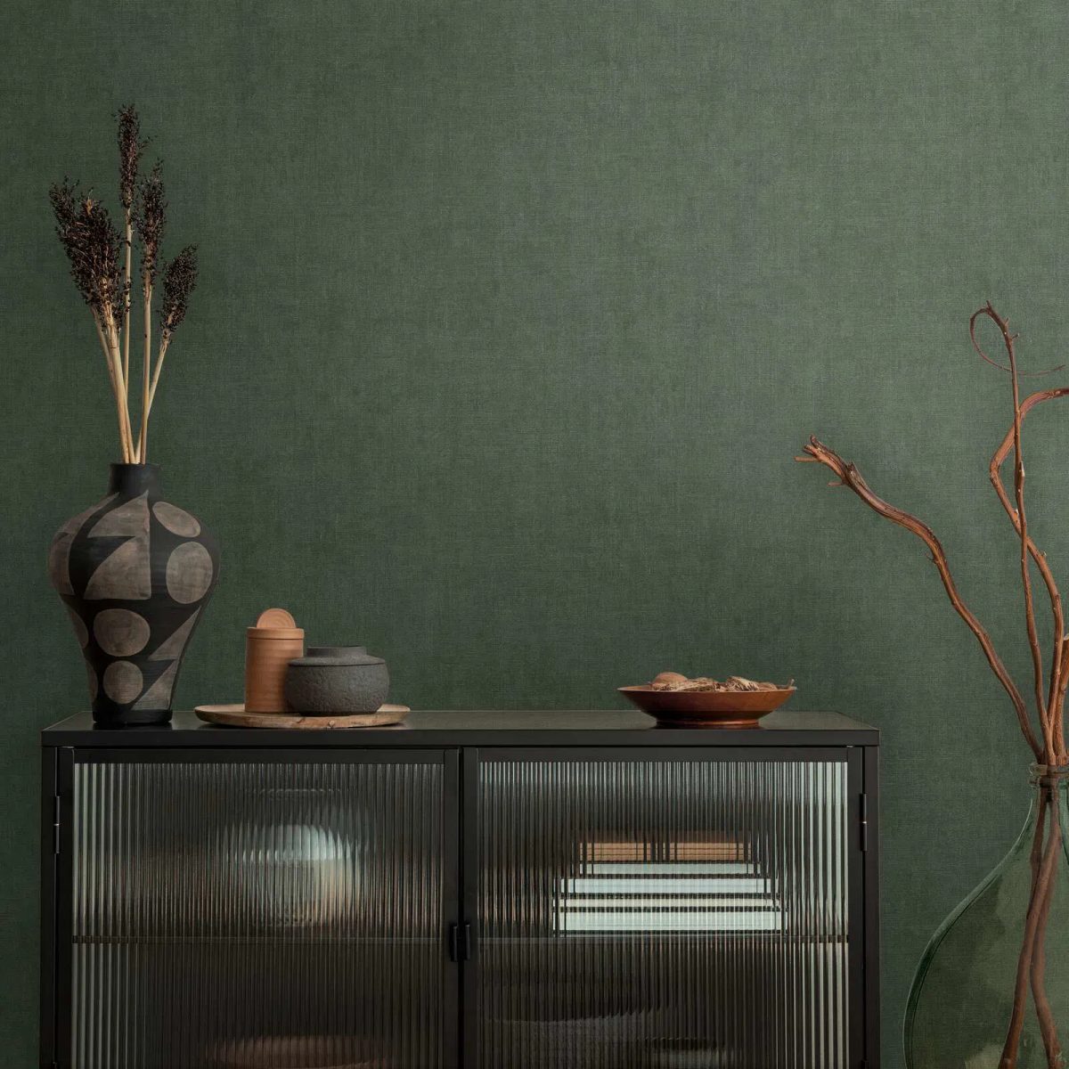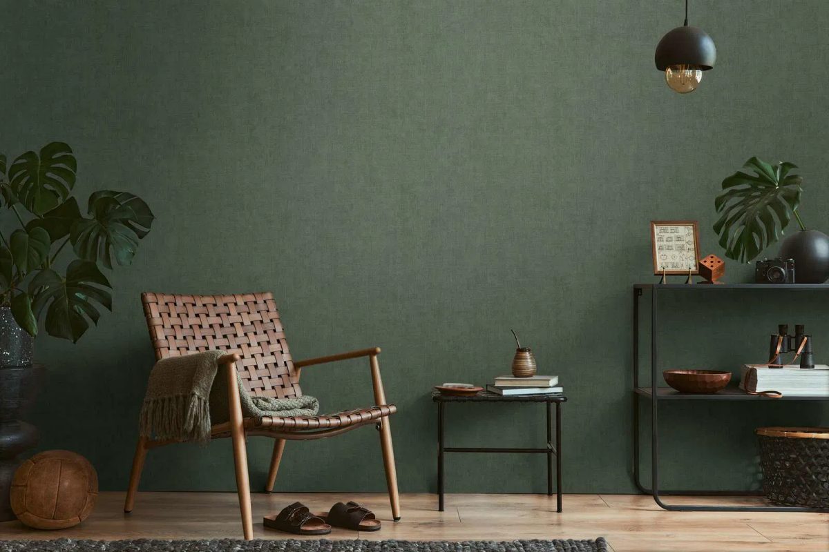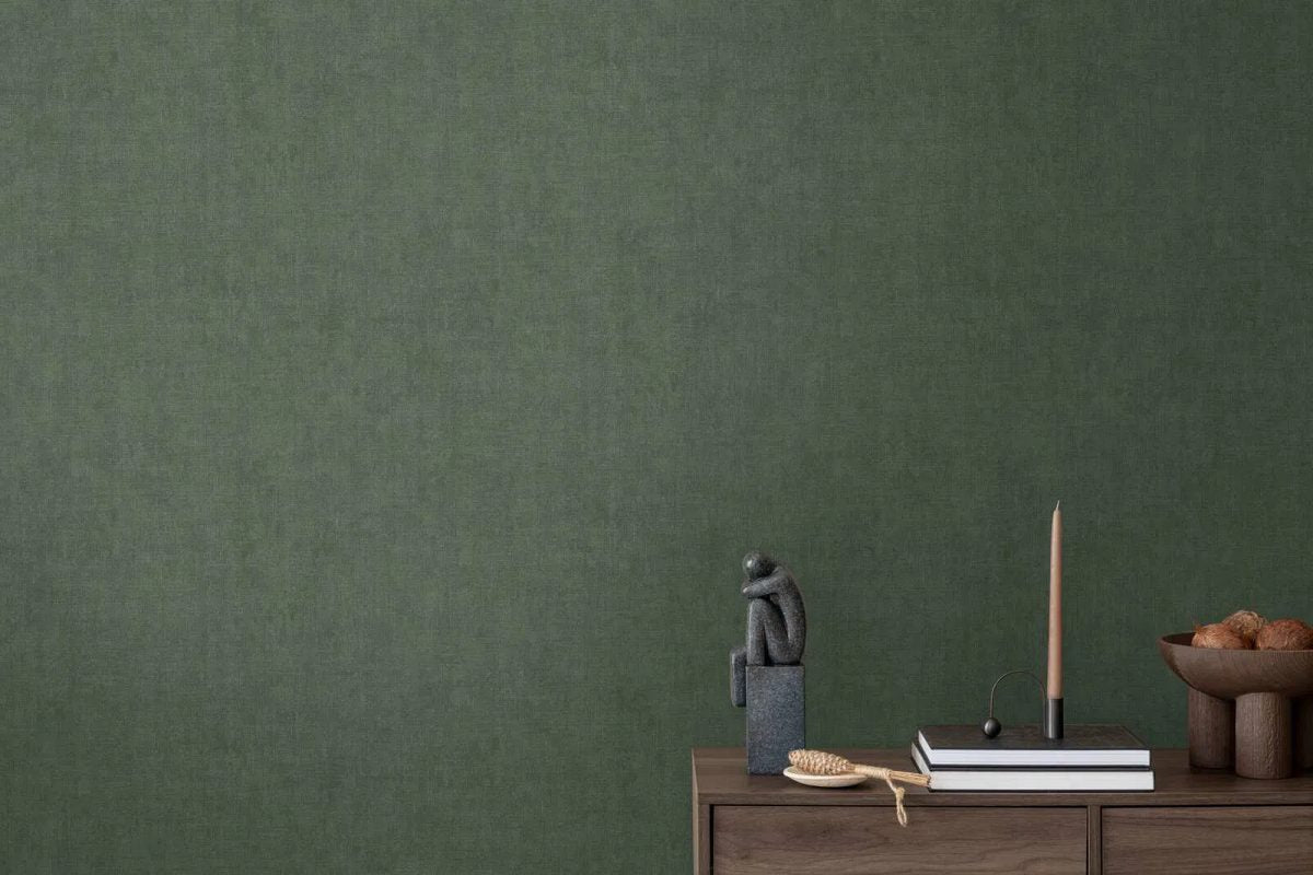 Greznas tapetes ar smalku auduma tekstūru un maigu mirdzumu. Tās ir ļoti praktiskas – viegli tīrāmas no netīrumiem. Ieklāšana ir vienkārša, jo raksts nav jāsaskaņo. Tumši zaļā krāsa kombinācijā ar mirdzumu rada dziļu, noslēpumainu un elegantu atmosfēru. Tās lieliski izskatās plašās telpās vai kā kontrasts gaišām mēbelēm, piešķirot telpai karalisku un stabilu noskaņu.