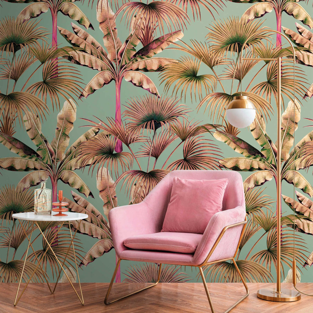 Krāsainas tapetes ar lapu rakstu un tropisku stilu, zaļā, bēšā, 1375230