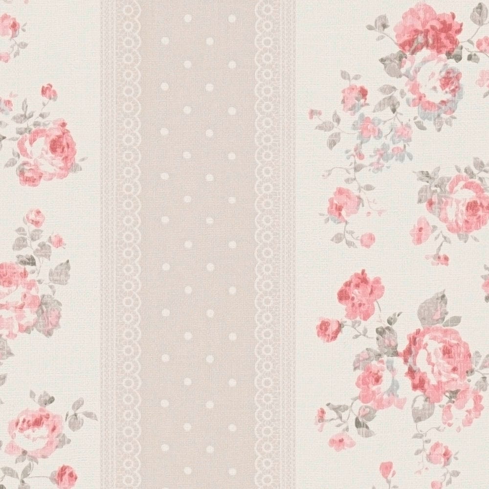 Tapetes ar svītrām, ziediem un punktiņiem: rozā, bēšā krāsā - 1373046