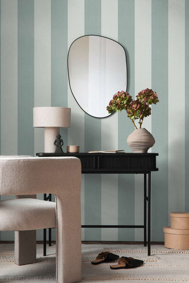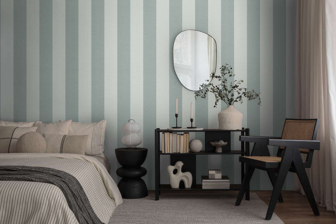 Zaļas tapetes ar svītrām un tekstila virsmu lieliski papildina dabu iedvesmotus interjerus.