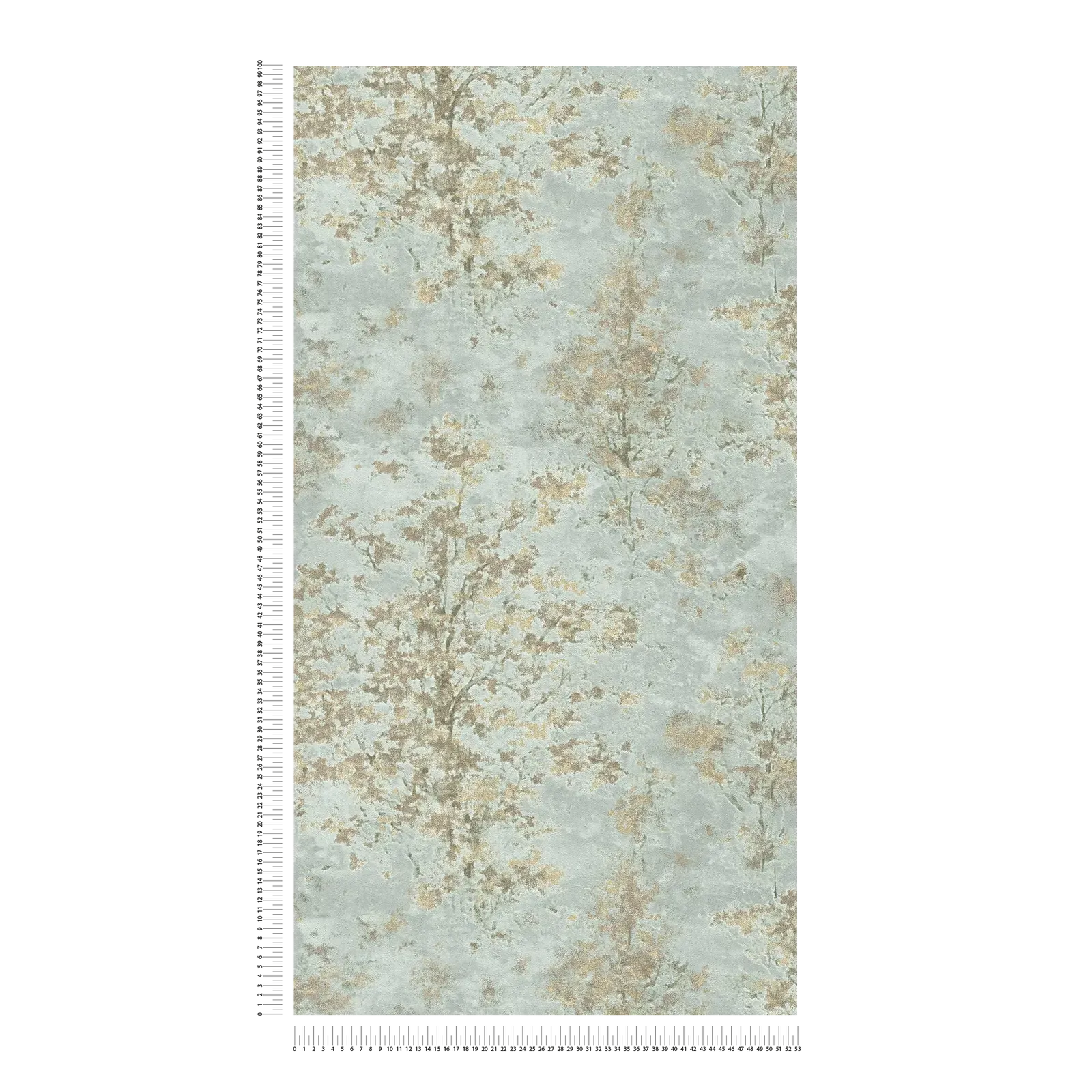 Smalks, zaru siluetu un zaru izkliedēšanās izskatās kā smalkas akvareļu struktūras uz matēta, nedaudz teksturēta fona. Raksts ir gandrīz miglains un izpildīts klusinātos, nedaudz pelēcīgos mīkstos toņos un maigās zelta un smilškrāsas niansēs. Mīkstās, izplūdušās malas rada iespaidu par vieglu miglu vai rīta rasu, piešķirot tapetēm dabisku svaigumu un maigu eleganci. Mirdzošie metāliski akcenti rada smalku dziļumu un piešķir motīvam kustību atkarībā no gaismas krišanas leņķa. Stils atgādina modernu, abstraktu dabas attēlojumu ar Āzijas motīviem, izstarojošs mieru, plašumu un nelielu greznību.