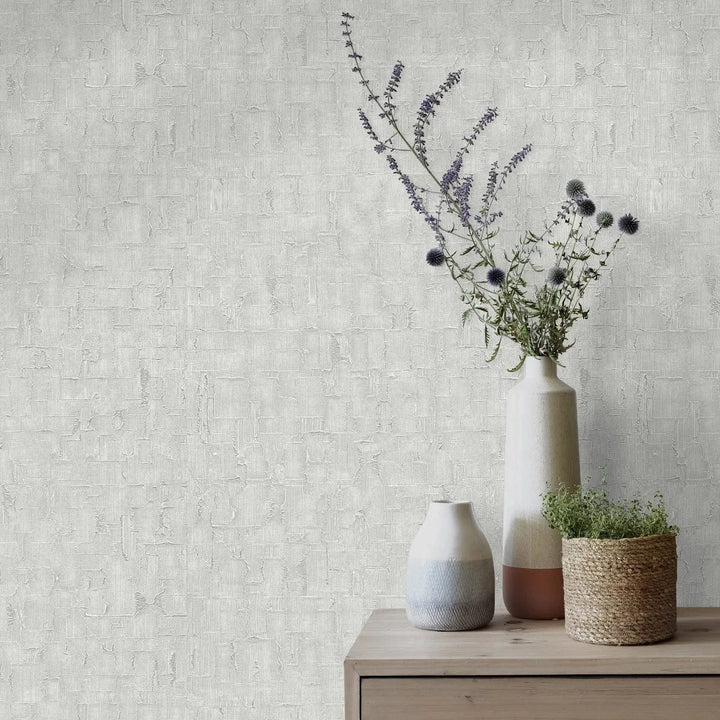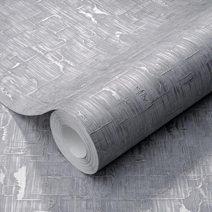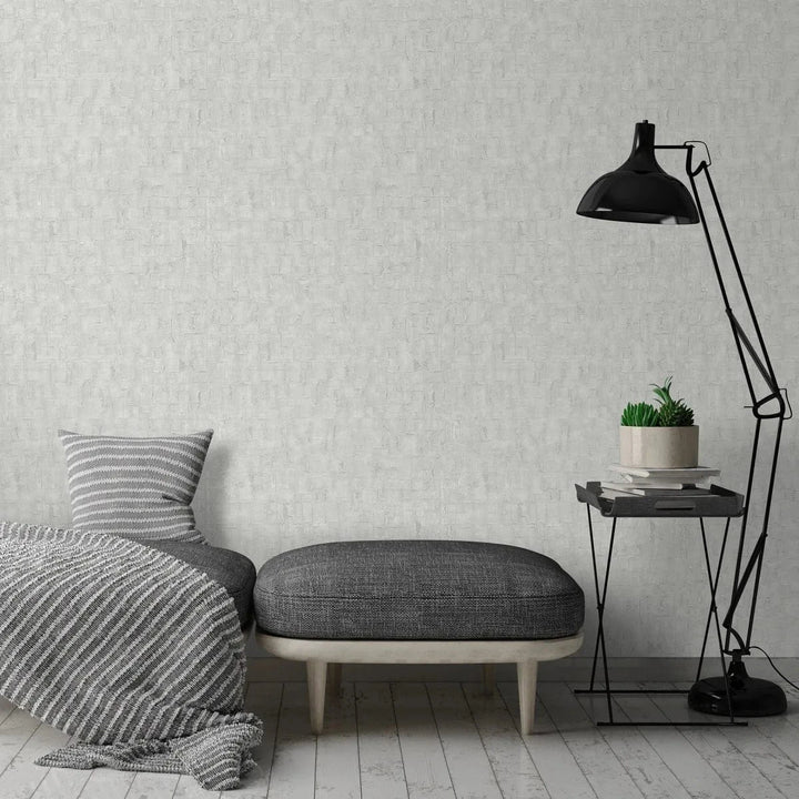 Pelēkas flizelīna tapetes ar abstraktu tekstūru piešķir telpai modernu un strukturētu izskatu