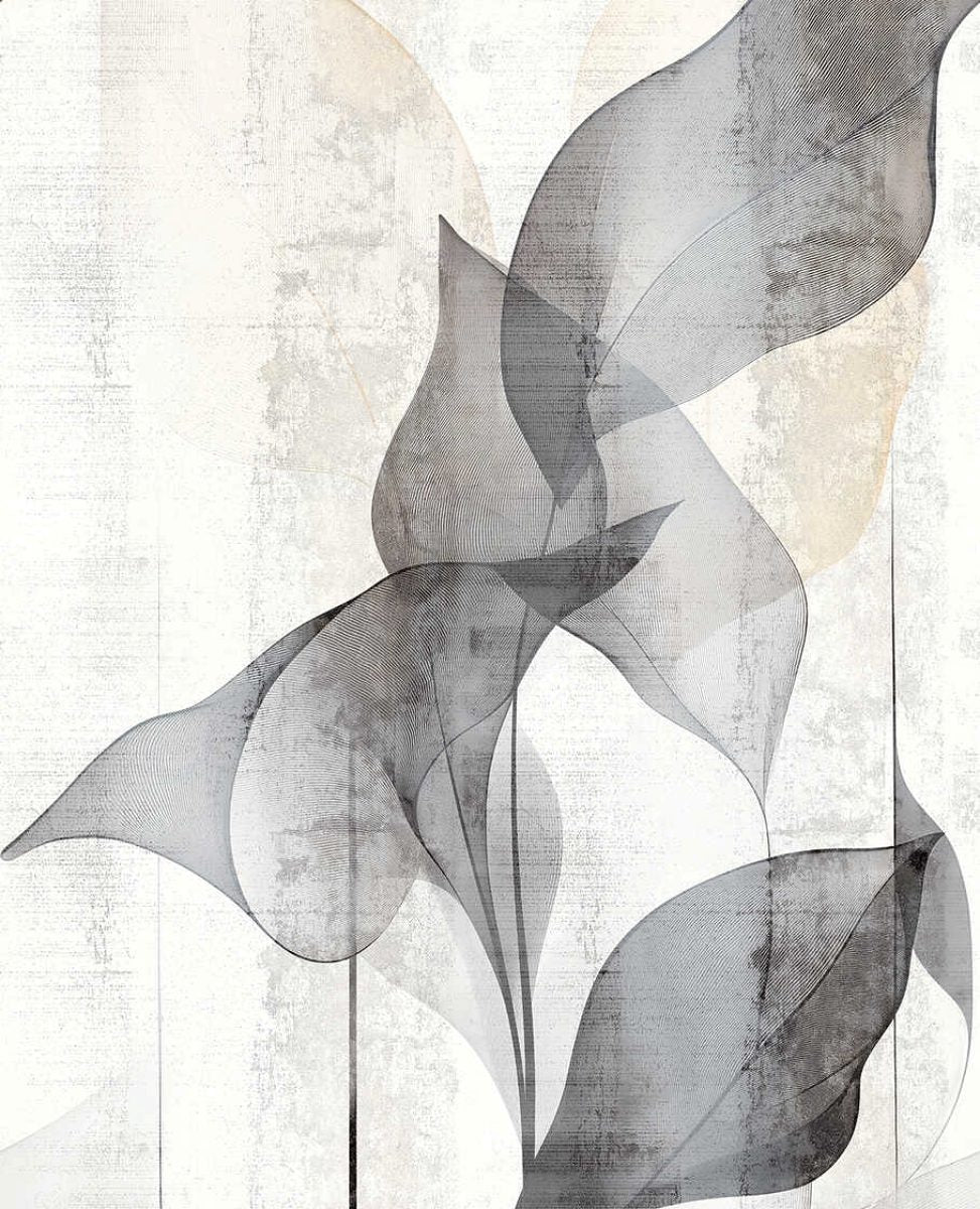 Lielas, delikātas lapas pārklājas slāņos un atgādina organiskas augu formas. Lapas ir caurspīdīgas pelēkās toņos no gaišā līdz tumšajam, ar mīkstām smilškrāsas un krēmkrāsas niansēm, kas reizēm parādās fonā. Smalki līnijas un vieglas ēnas piešķir motīvam dziļumu, bet kontūras ir apzināti delikātas un caurspīdīgas. Fona virsma ir nedaudz teksturēta, gandrīz kā nokalpojis apmetums, un tādējādi papildina tapetes eleganto, moderno izskatu. Kopumā dizains rada mierīgu, elegantu atmosfēru ar nedaudz poētisku, gandrīz peldošu efektu. Harmoniskā, neitrālā krāsu gamma padara telpu gaišu un plašu, vienlaikus radot nomierinošu un stilīgu efektu.