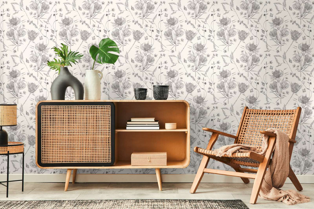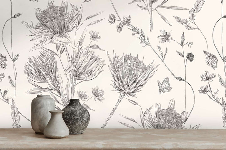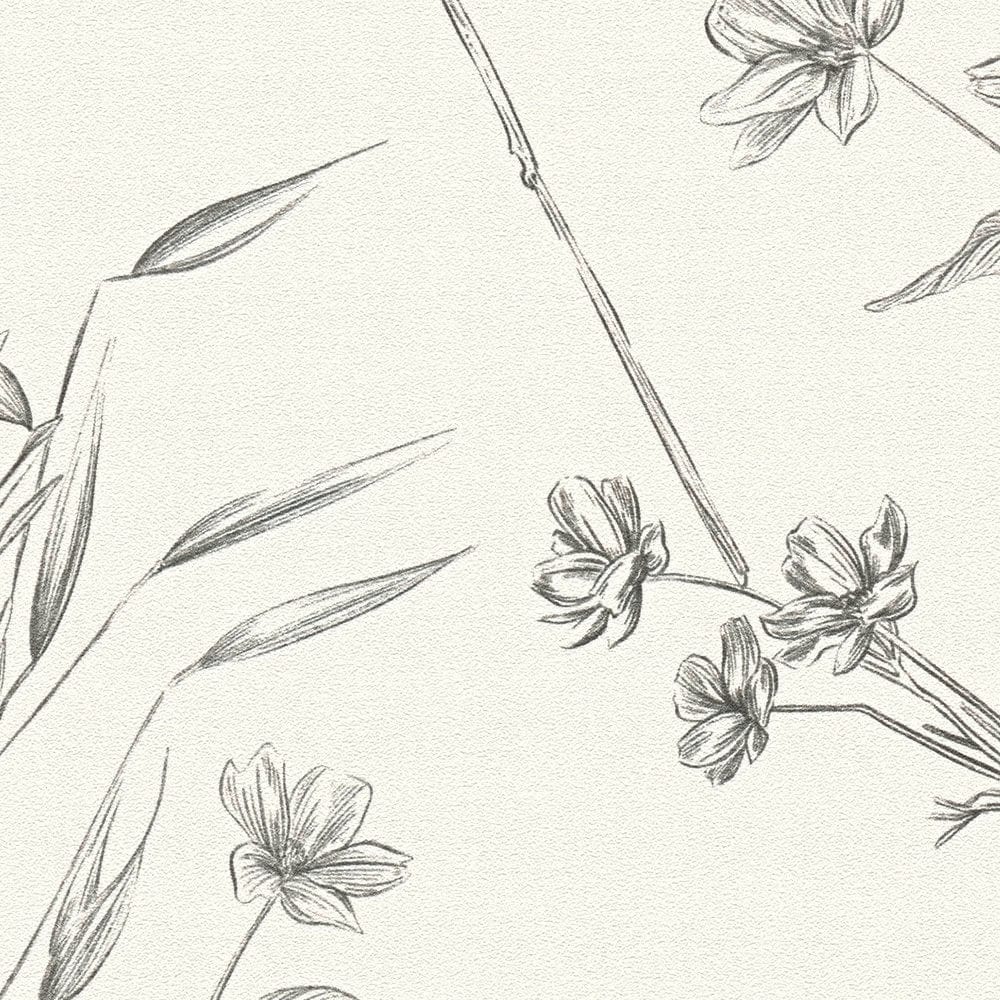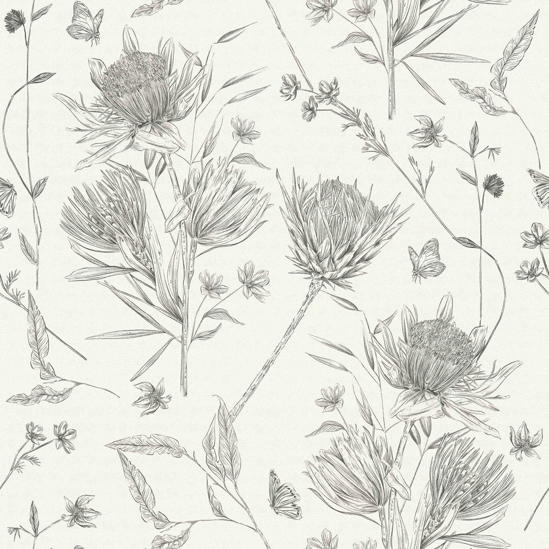 Tapetes ar ziediem un tauriņiem, matētas: melnbaltas, 1402040