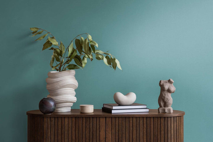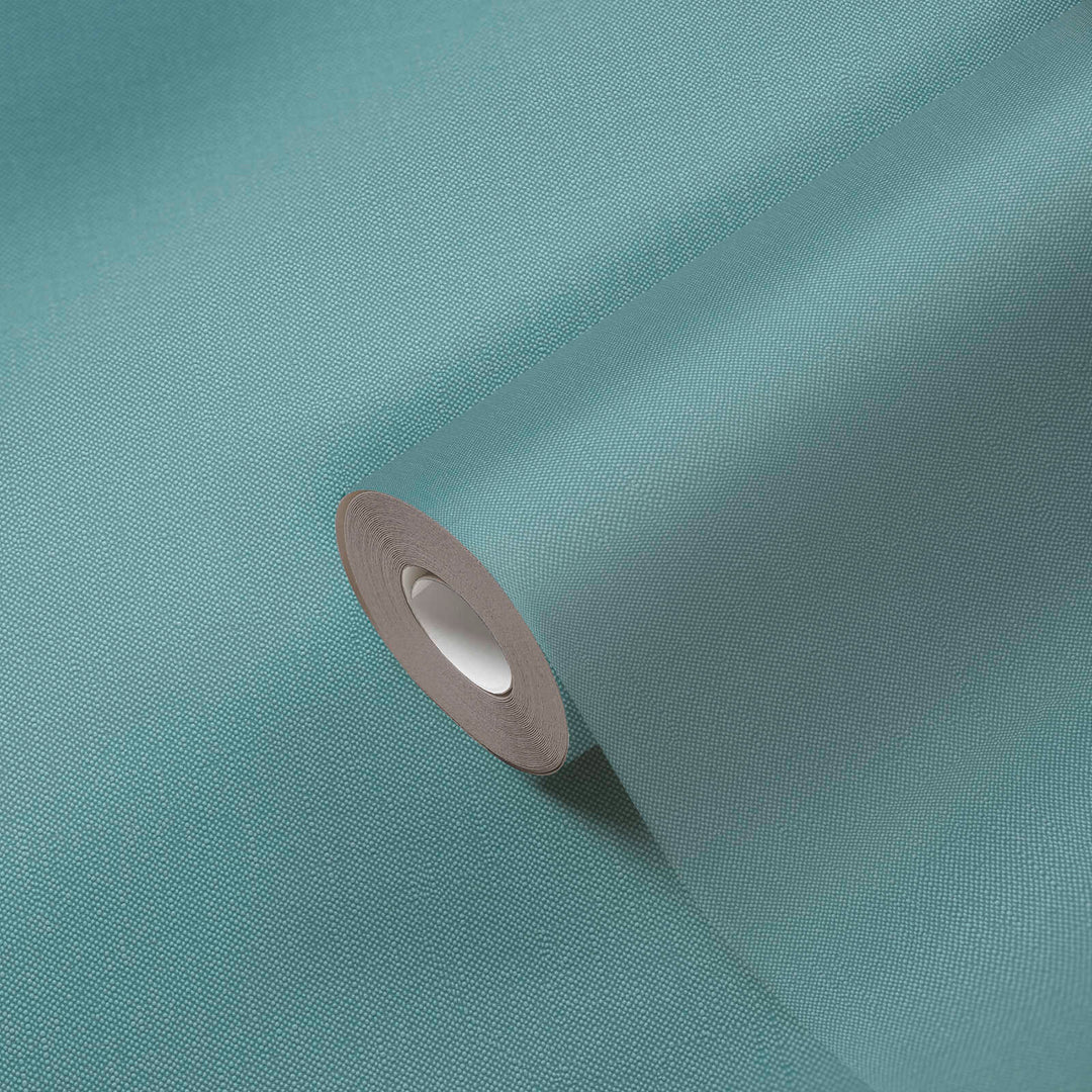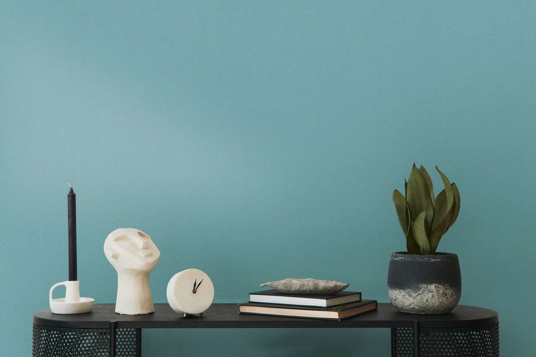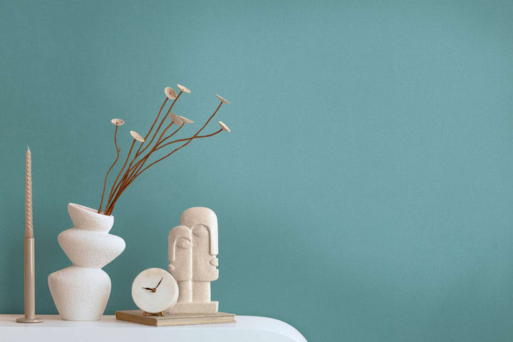 Tirkīza krāsas tapetes ar teksturētu, matētu virsmu piešķir interjeram svaigu un modernu izskatu.