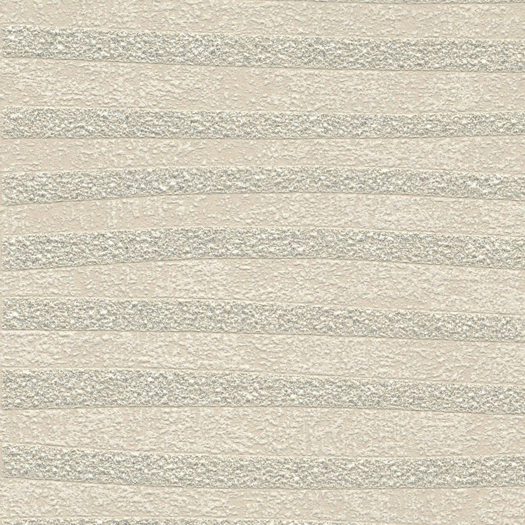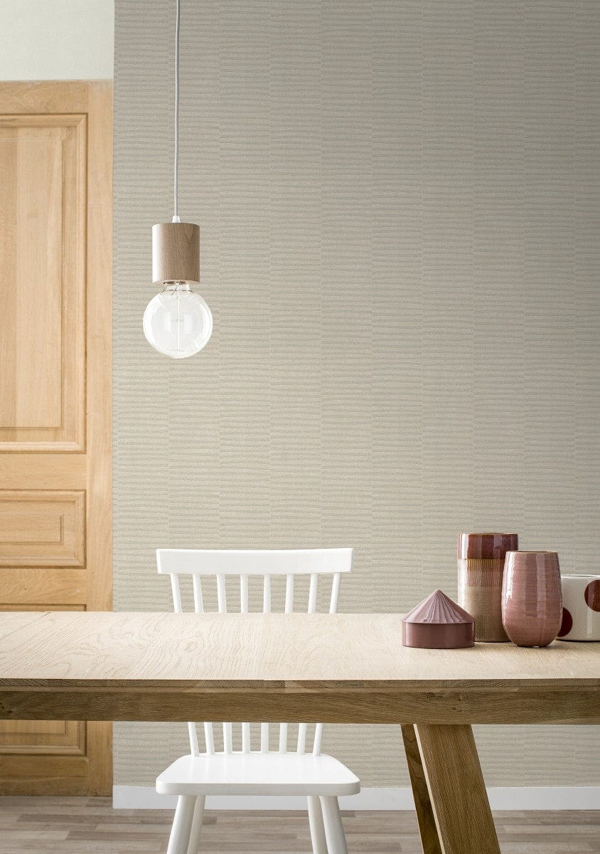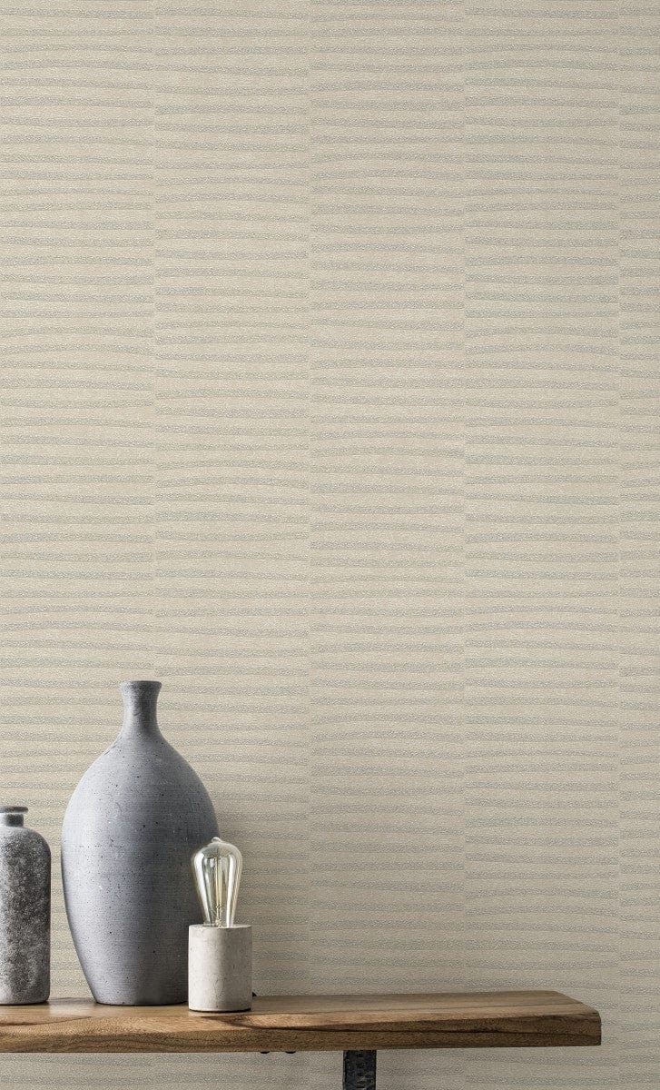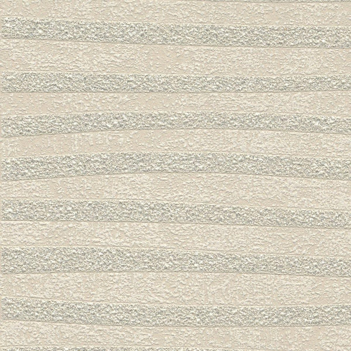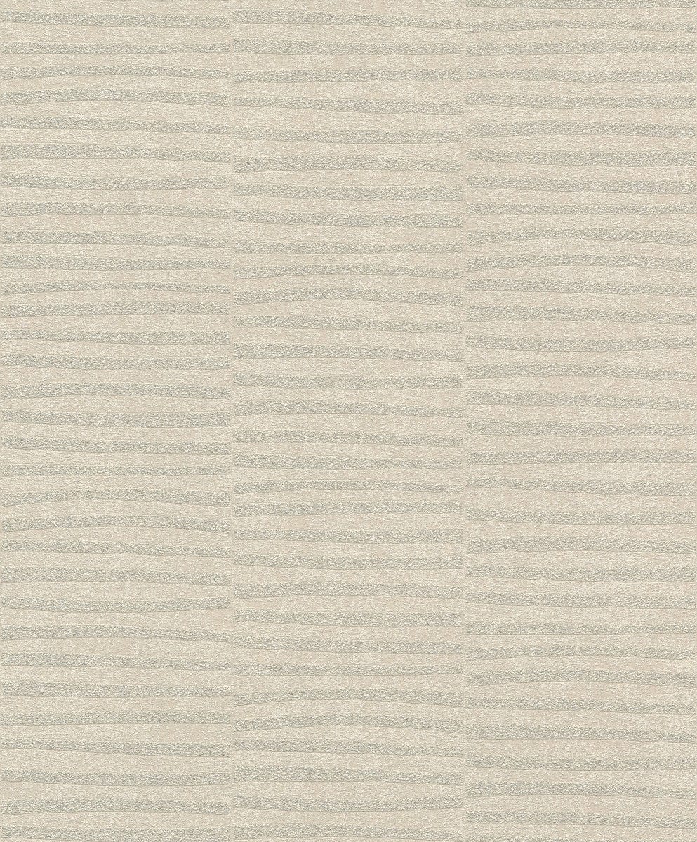 Aicinām visus svītrveida raksta cienītājus: šeit šis mūžīgais raksts ir klasiskā, bet krāšņā dizainā, kas veidots raķišā leņķī. Sudraba krāsas svītras mirdz uz bēša krāsas fona, radot īstu šarmu un piešķirot jūsu sienām jaunu, mirdzošu izskatu.