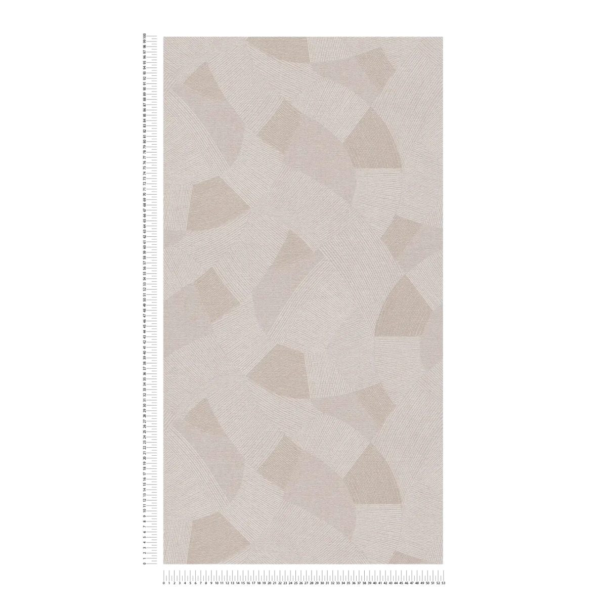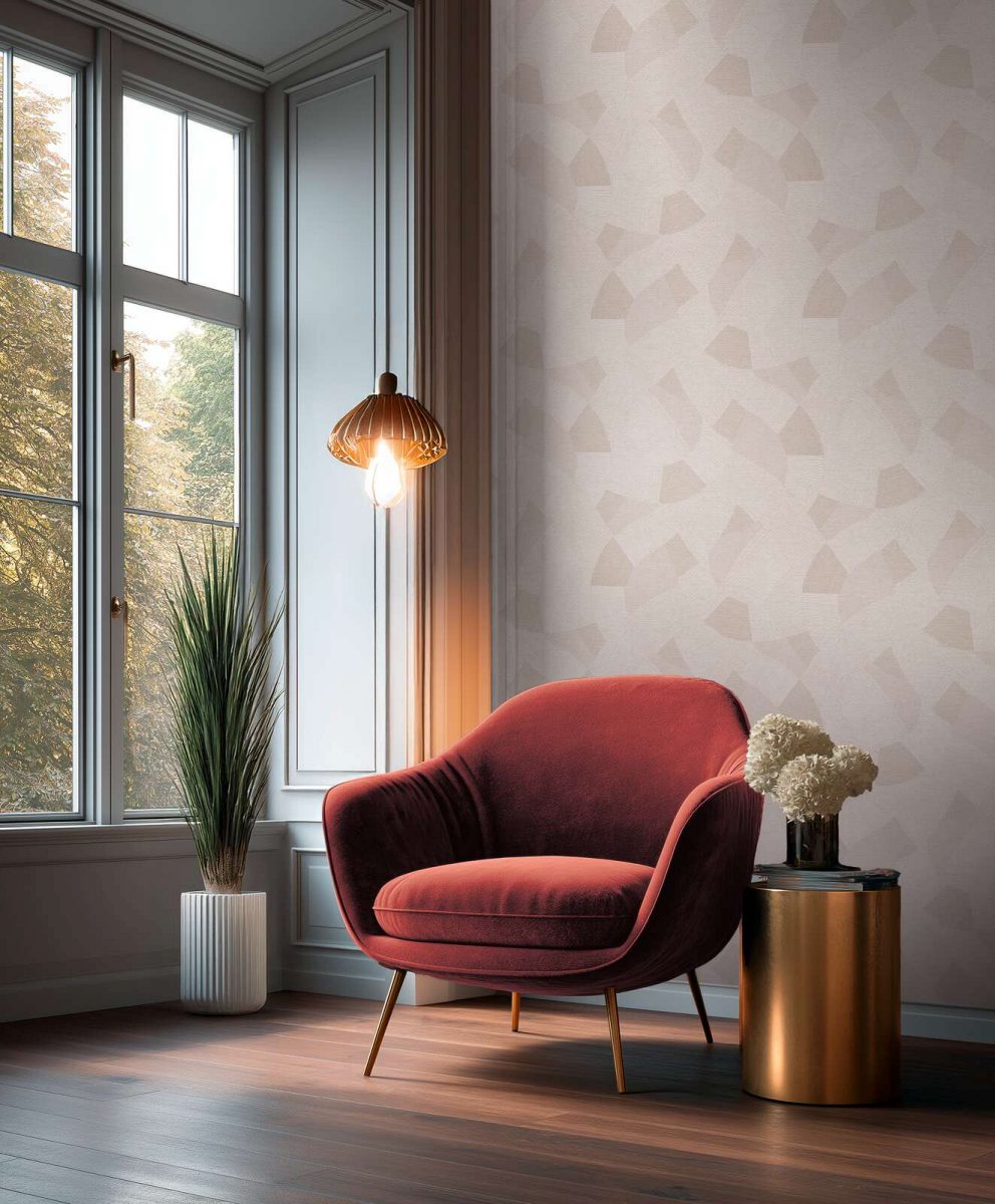 Izsmalcinātas tapetes ar nedaudz spīdīgu virsmu, kas telpai piešķir mūsdienīgu eleganci. Tās ir noturīgas pret skrāpējumiem un viegli tīrāmas no netīrumiem. Uzklājot paneļus ar 64 cm raksta soli taisnā līnijā, tiek panākts vienmērīgs sienas pārklājums. Silti pelēkais tonis ir ideāls fons modernam interjeram – tas ir neitrāls, bet ar raksturu. Ģeometriskie segmenti un smalkās līniju struktūras uz pelēkā fona rada vizuālu dinamiku, nepadarot telpu nemierīgu. Spīduma un matēto līniju mijiedarbība piešķir sienām dziļumu.