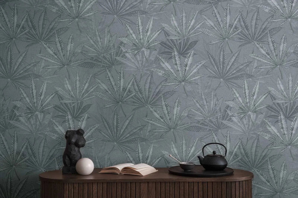 Flizelīna tapetes ar lapu rakstu džungļu stilā - zilgani pelēka krāsā AS Creation