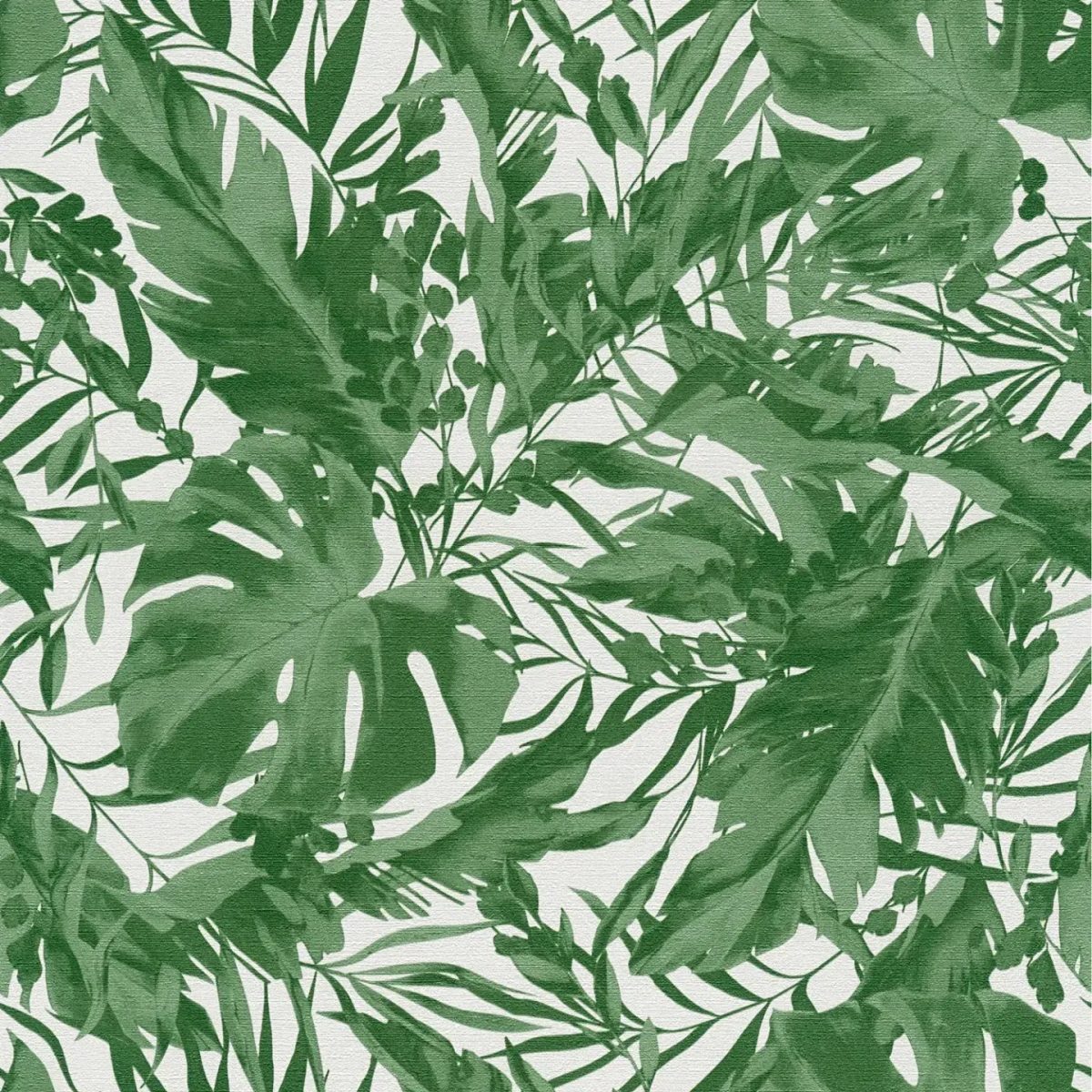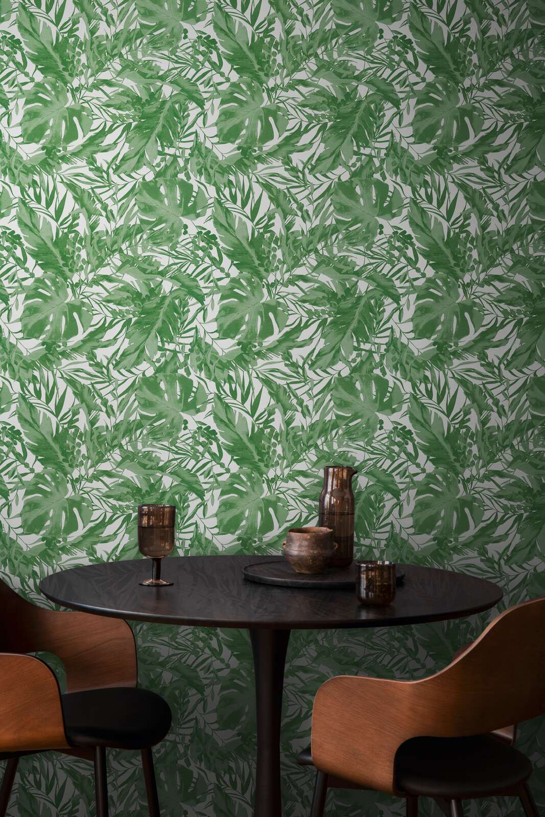 Lielas, sulīgas tropisko augu lapas dominē rakstā un pārklājas ar dažādiem zaļas krāsas toņiem. Lapu formas atgādina monstera, papardes un citus eksotiskos augus, kas ir bagātīgi detalizēti, bet zīmēti brīvā, akvareļveida stilā. Zaļie toņi mainās no bagātīgas lapu zaļas krāsas līdz delikātiem, caurspīdīgiem toņiem, radot vieglu, svaigu atmosfēru. Baltā fona dēļ zaļā krāsa izskatās īpaši dzīvīga un uzsver motīva dabisko raksturu. Dizains rada blīvas tropu džungļu sajūtu un, pateicoties dabisko formu un krāsu kombinācijai, telpā ievieš relaksējošu, atspirdzinošu efektu.
