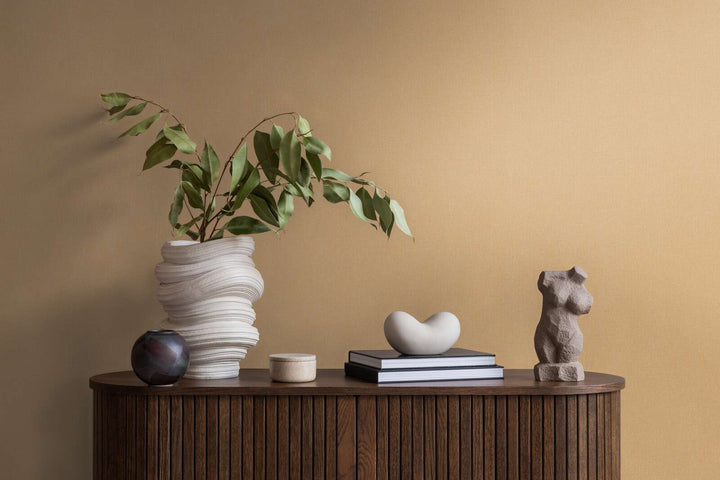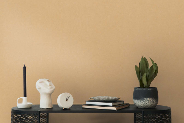 Flizelīna tapetes ar teksturētu izskatu oranžos toņos ienes siltumu un dinamiku jebkurā interjerā, lieliski piemērotas akcenta sienām.