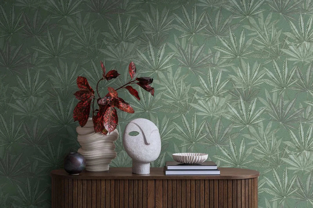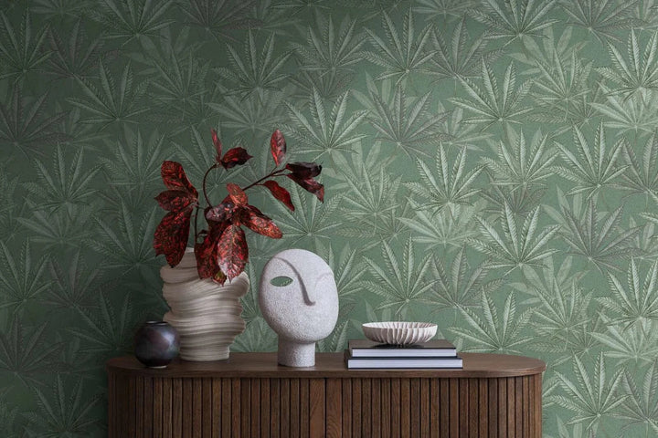 Zaļās flizelīna tapetes ar lapu rakstu džungļu stilā piešķir telpai tropisku svaigumu un dzīvīgumu.