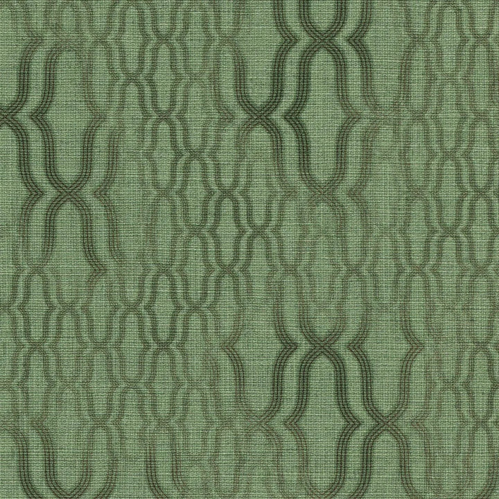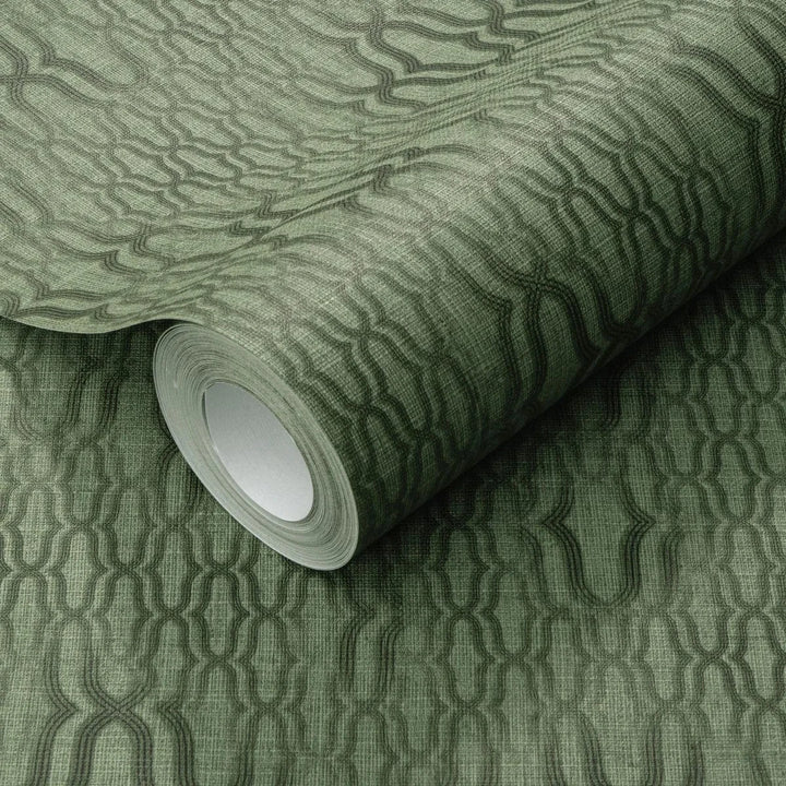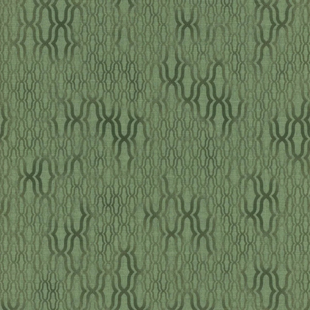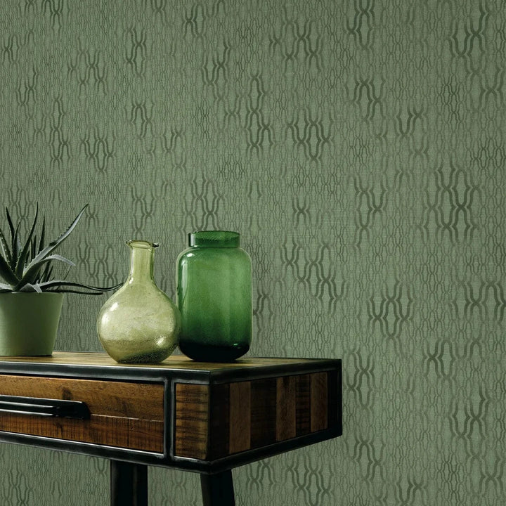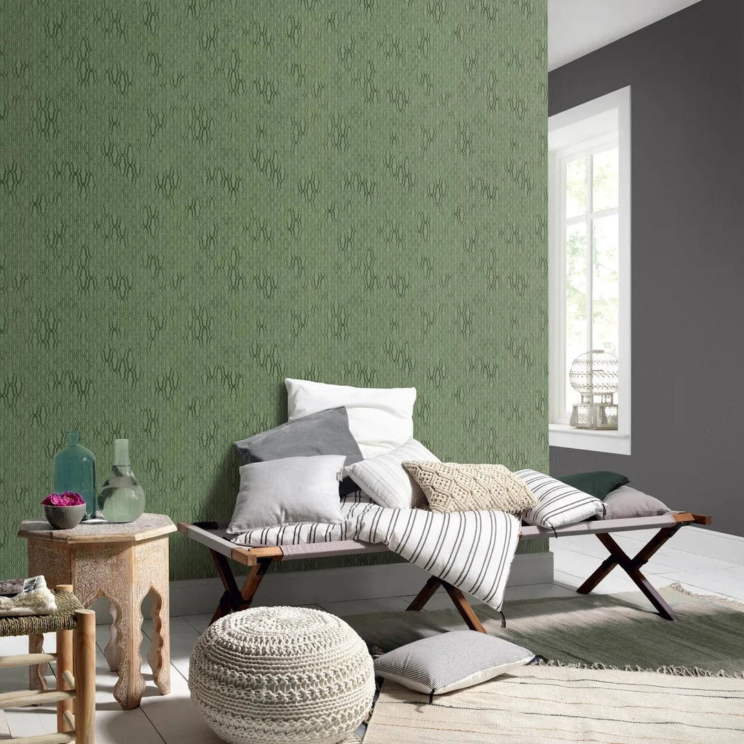 Zaļas ornamenta tapetes ar matētu virsmu lieliski iederas dabiskos interjera toņos.